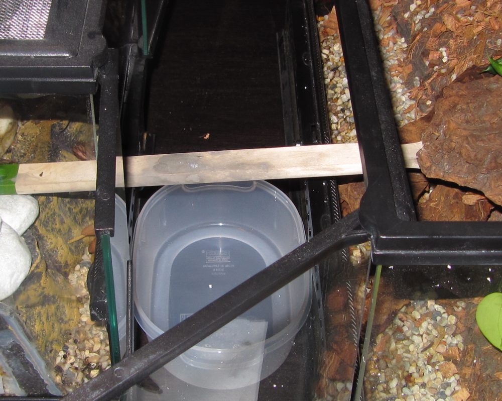 Da ich mir und den Tieren das mühsame und gefährliche (Zerquetschungsgefahr) auseinanderbauen der Anlage ersparen wollte, musste eine Verbindung her, über die die Ameisen das neue Formicarium selber entdecken konnten. Ich entschied mich für eine Brücke, bestehemd aus einem Heizungspinsel, den ich einseitig mit einer Wurzel beschwert habe. Besser wäre wohl ein Uprofil gewesen, das als Bahn mit "Geländer" gewirkt hätte. Ectomomyrmex astutus sind schlechte Kletterer, deshalb positionierte ich ein "Auffangbecken" unter der Brücke.