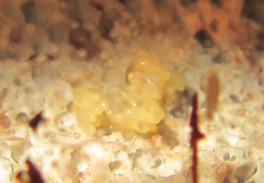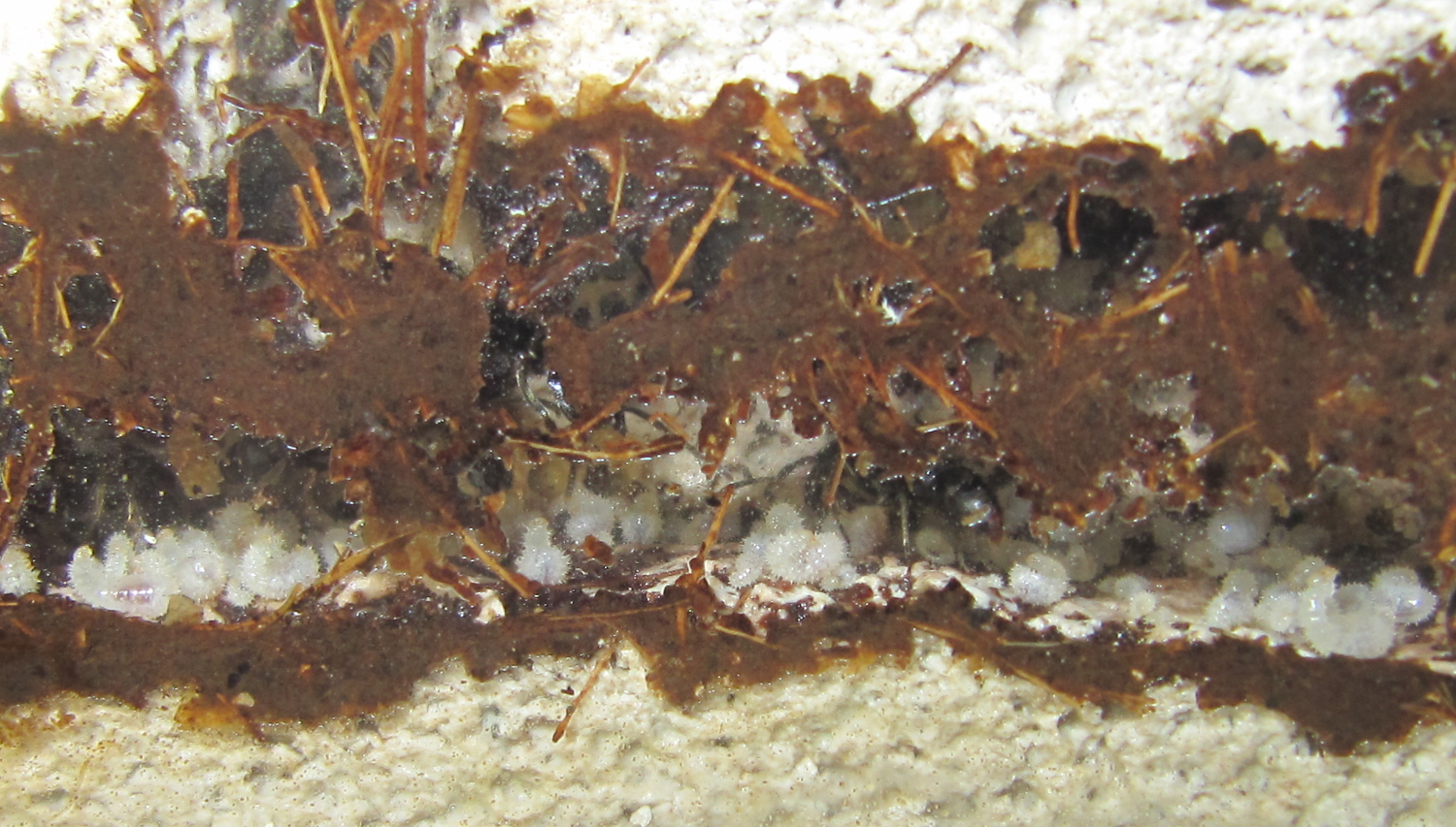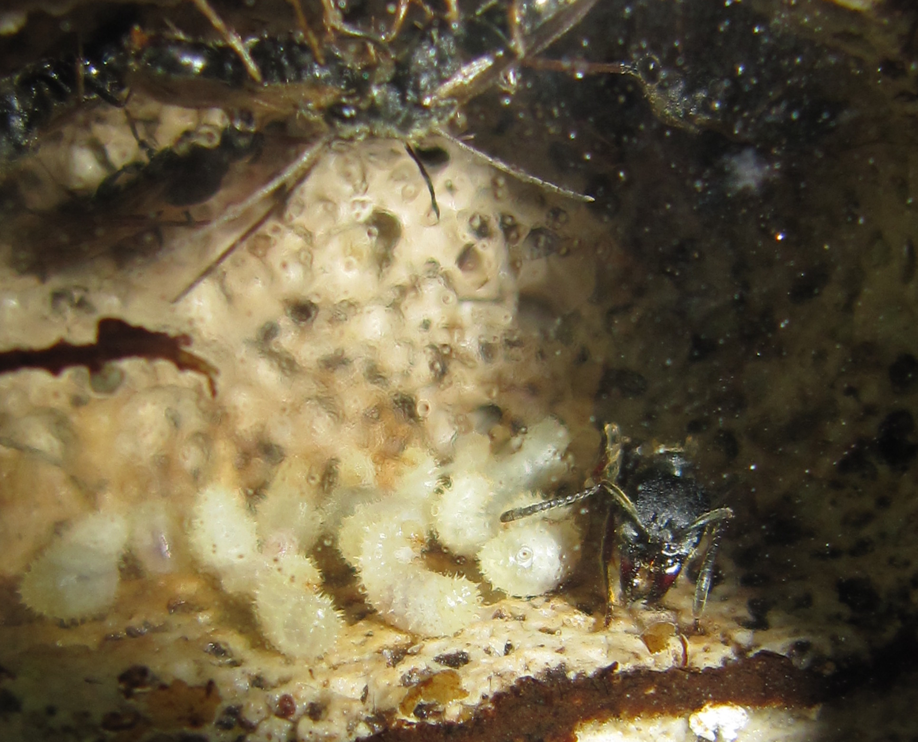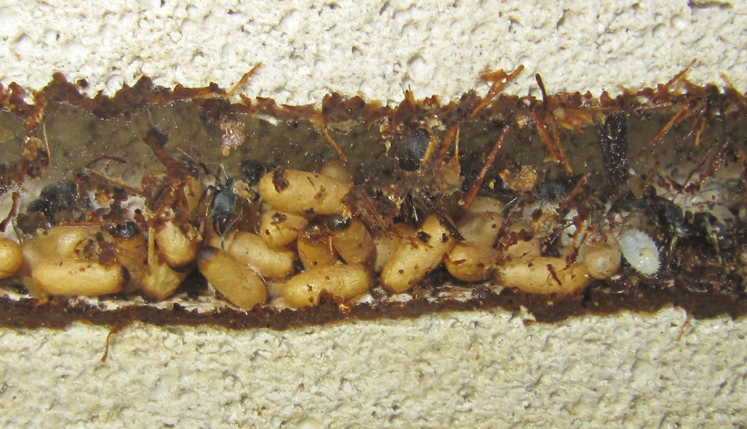 Bei meinen Ectomomyrmex astutus gibt es wieder Larven. Wie lange schon, weiss ich nicht. Zwei Larven sind allerdings schon recht gross, während rund 20 andere noch ganz klein sind. Des Weiteren sind viele Eipakete vorhanden, es sind mindestens 30 Eier.