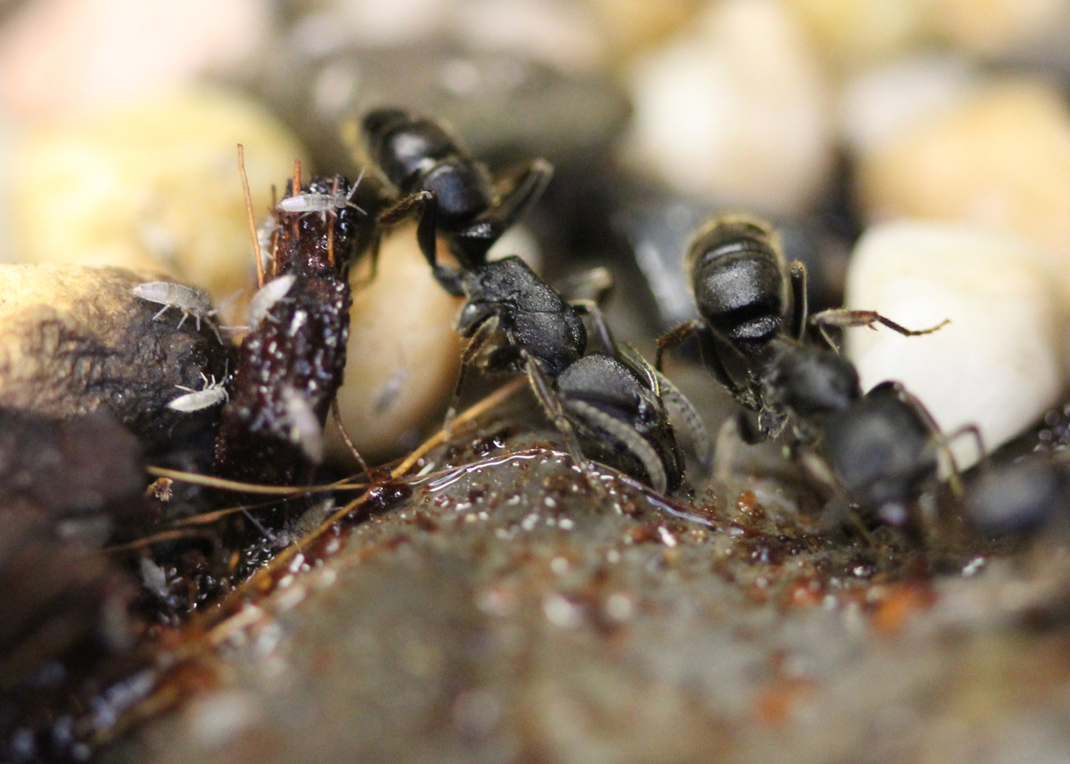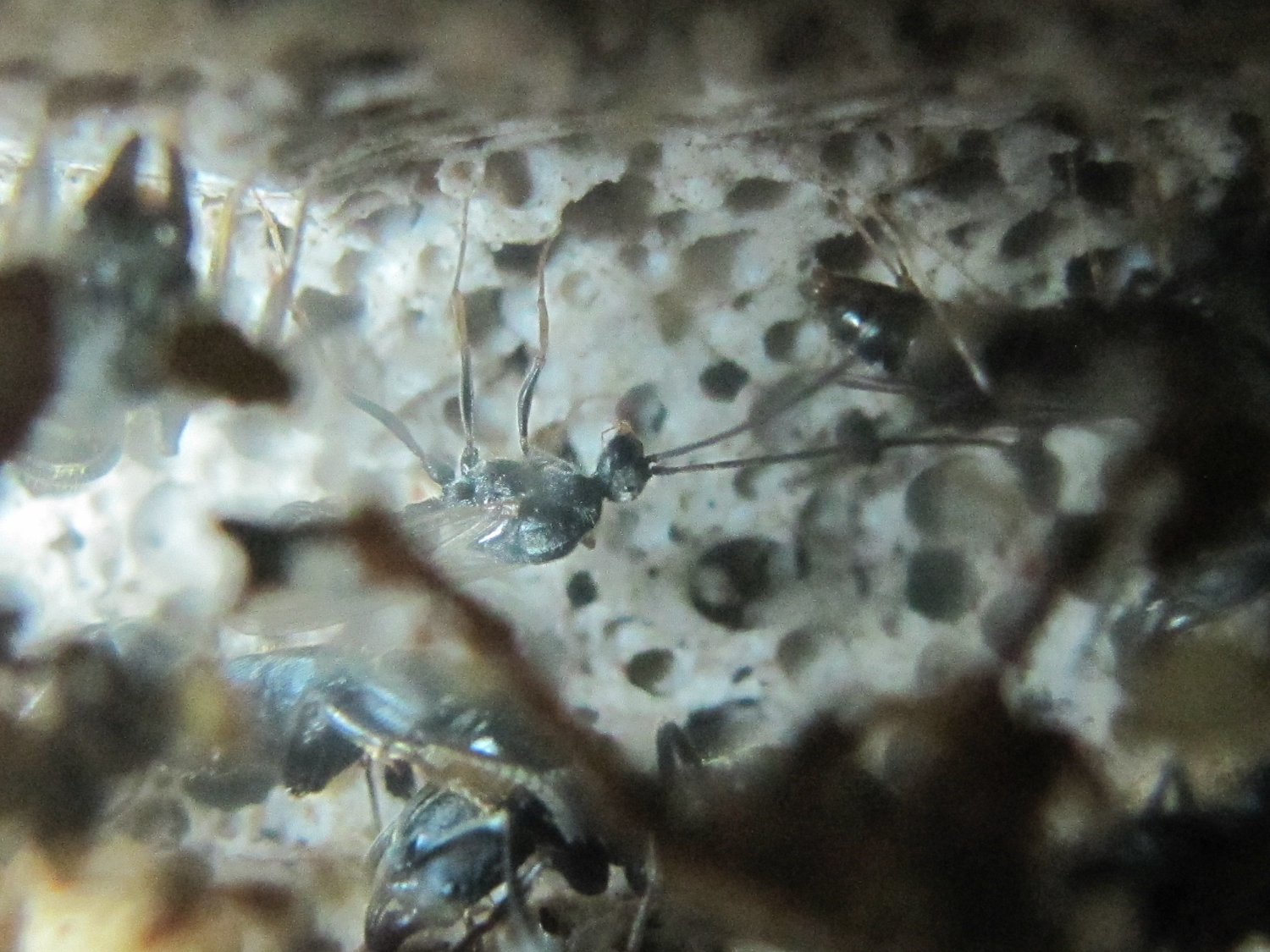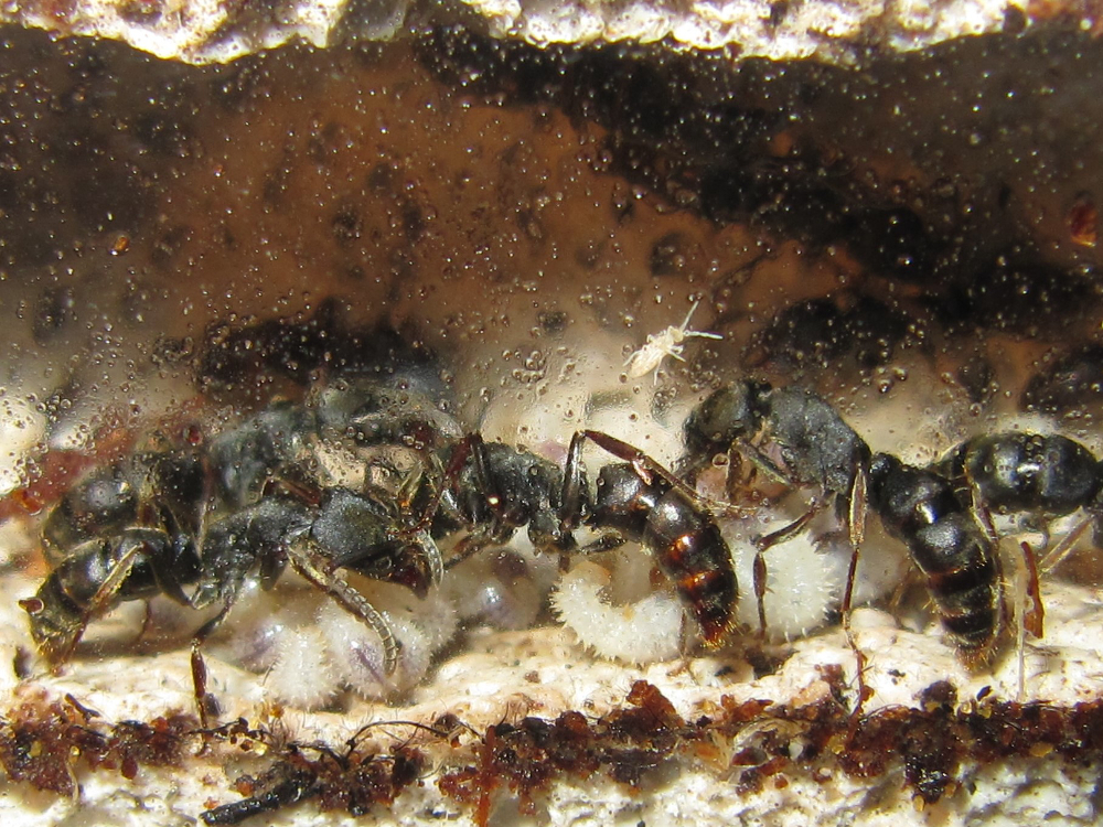 Eine neue interessante Beobachtung konnte ich noch machen, aber leider nicht fotografisch festhalten: Ectomomyrmex astutus kann Springschwänze erbeuten. Normalerweise leben die Tiere friedlich bei einander. Die Springschwänze verwerten Müll und dürfen sogar ans Honigwasser und an Futtertiere. Sie weichen aber zurück, sobald eine Ameise sich nähert.