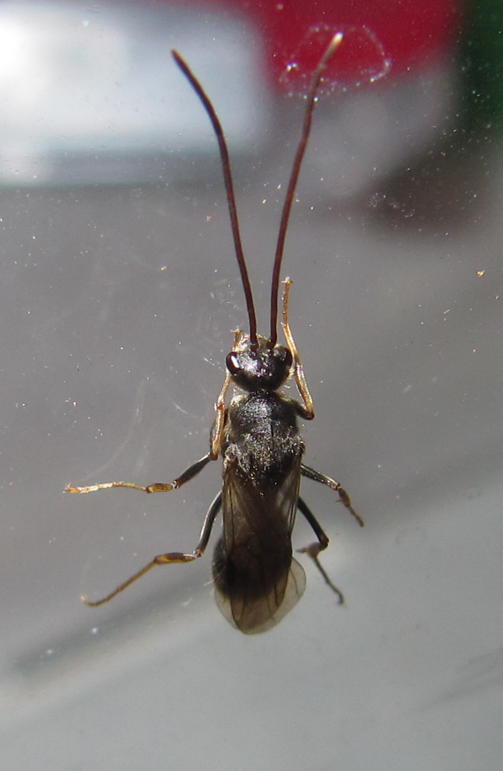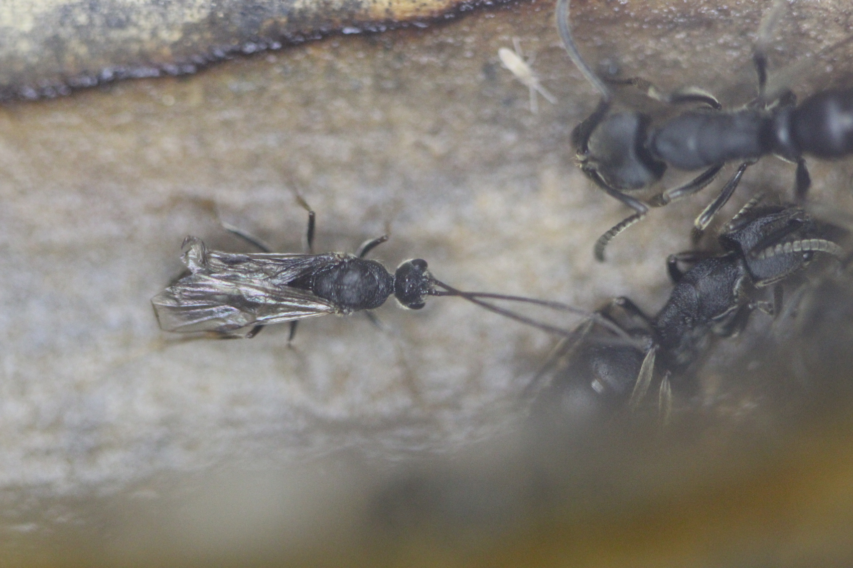 Ausserdem hat ein Männchen das Nest verlassen (oder es wurde von einer Arbeiterin transportiert). Es ist mir in einem Zweignest mit einigen Arbeiterinnen aufgefallen, Puppen wurden dort aber noch nie untergebarcht. Die Flügel des Geschlechtstiers sind deformiert.