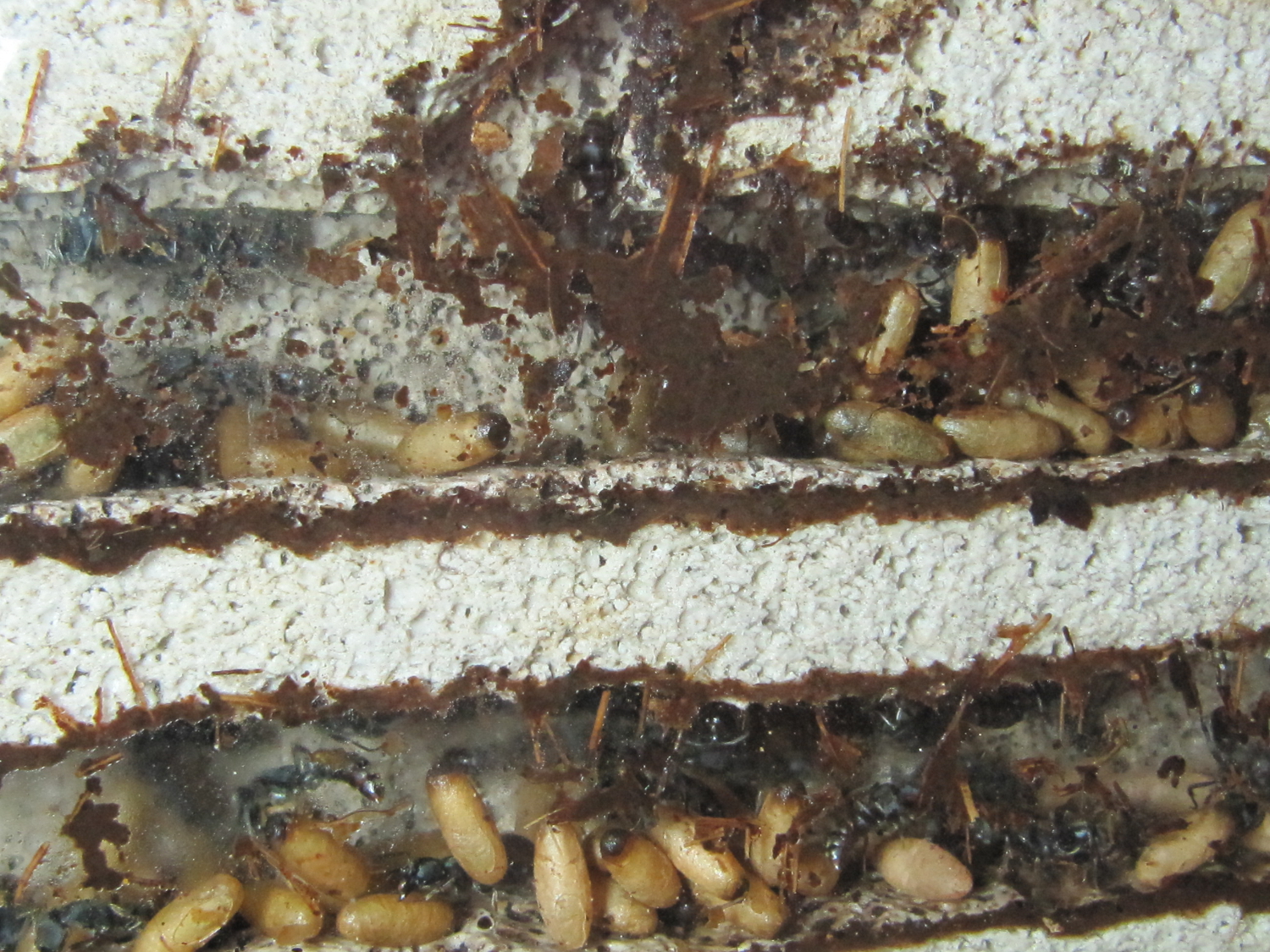 Der Kolonie scheint es nach wie vor sehr gut zu gehen. Der Appetit auf Insekten ist riesig. Kämpfe zwischen den Arbeiterinnen sind mir nicht mehr aufgefallen. Es gibt weiterhin keine Eier und die kleinen Larven sind verschwunden. Wohin ist auch klar, es gibt jetzt viele Puppen und grosse Larven. Es sind zudem zwei Friedhöfe entstanden, eine erhöhte Sterberate ist dabei nicht festzustellen, aber ich bin weiterhin davon überzeugt, dass die Arbeiterinnen dieser Art natürlicherweise nicht besonders alt werden. Das schliesse ich aus dem Verhältniss der Brut zum Kolonienwachstum.