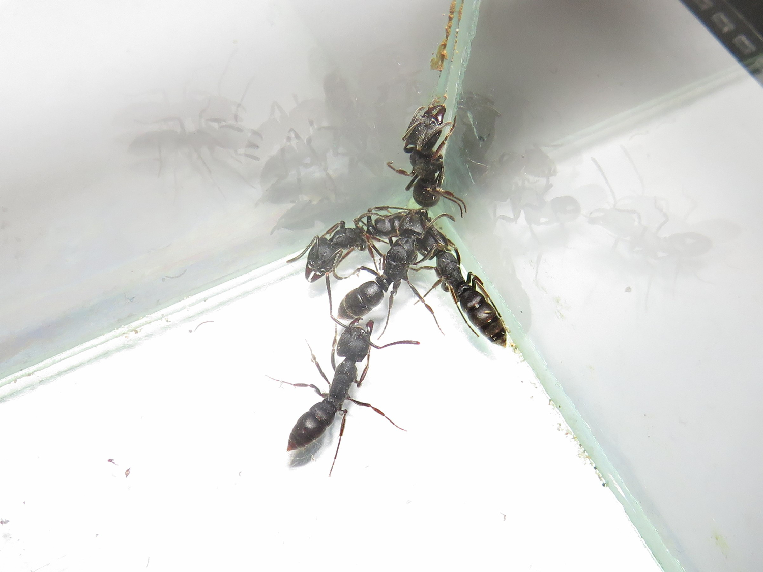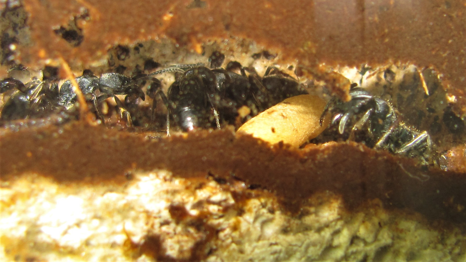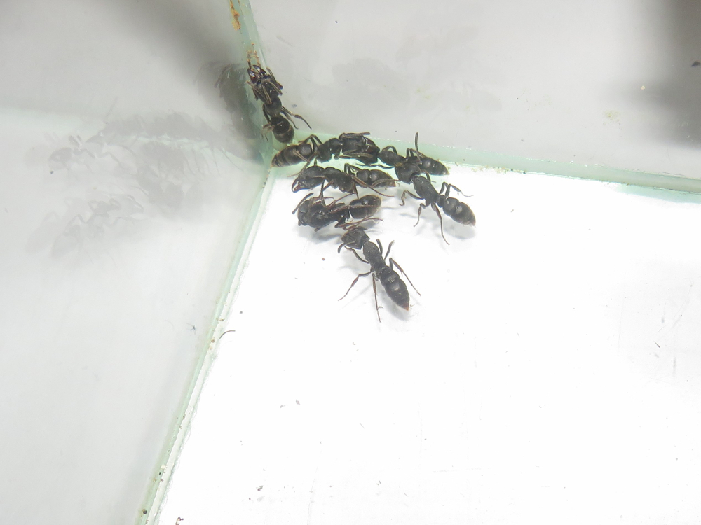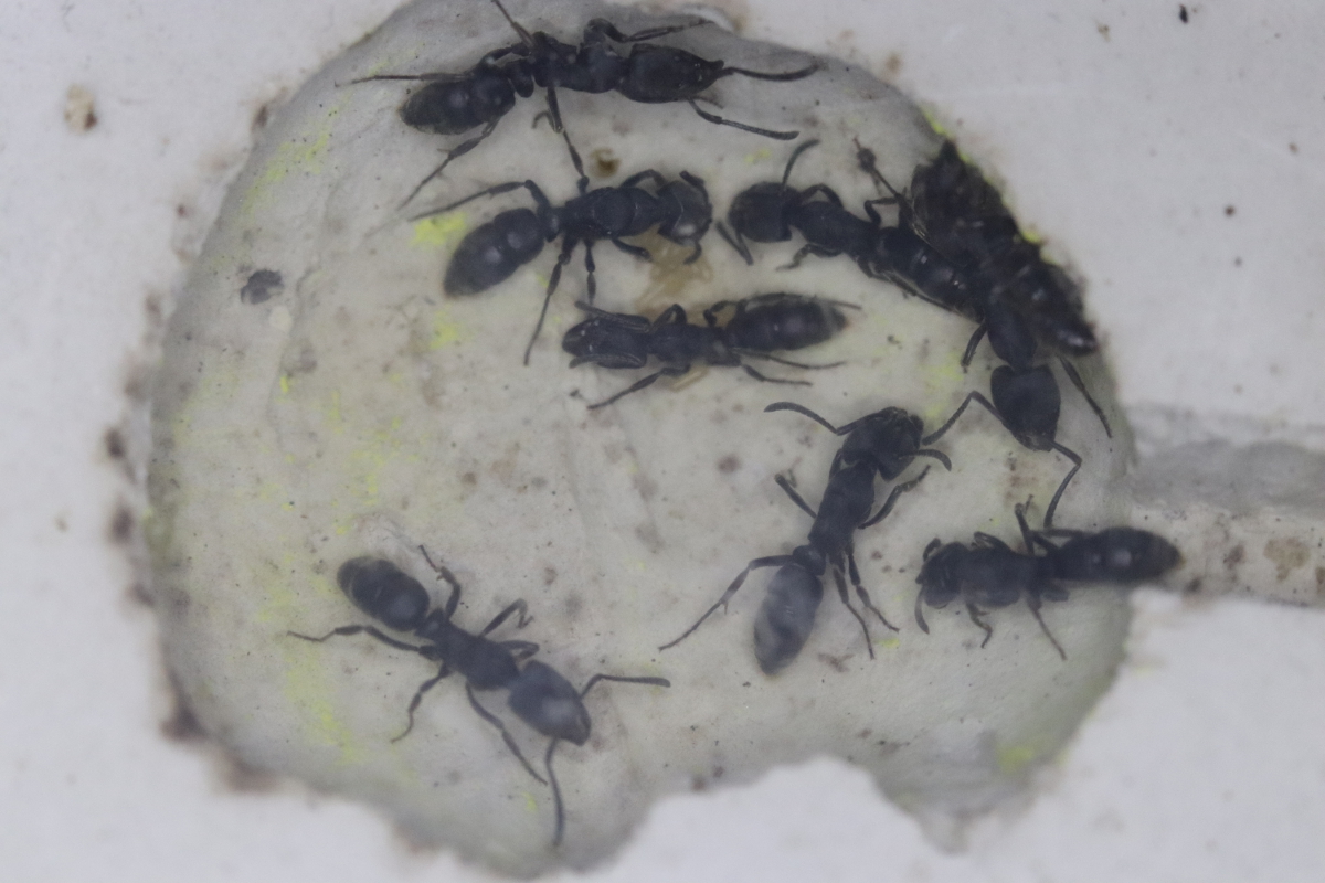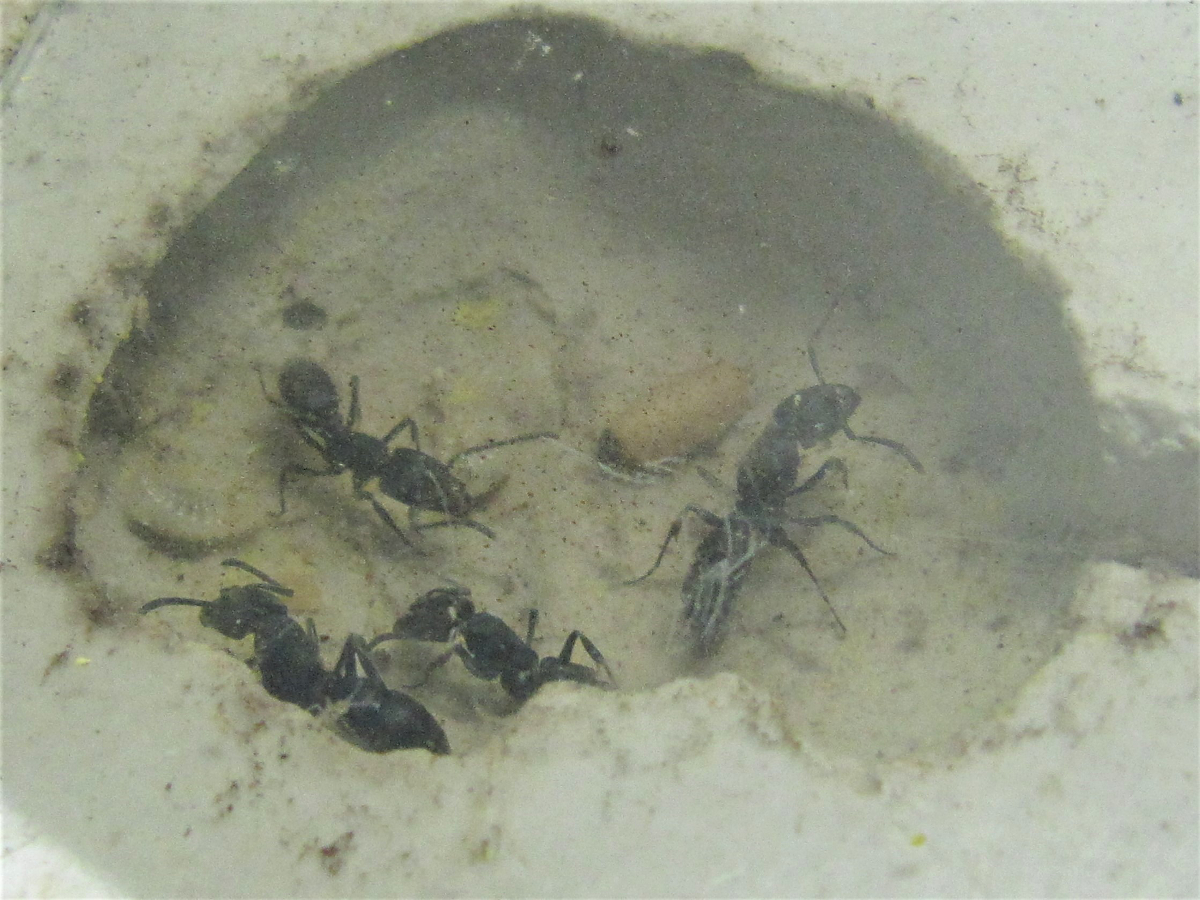 Tagsüber wirkt die kleine Kolonie fast lethargisch, die Ameisen verweilen im Nest, die meisten regungslos. Nachts ändert sich das Verhalten. Sowohl im Nest gibt es Bewegung, als auch "draussen". Im Formicarium streifen dann zwei bis fünf Arbeierinnen umher und suchen Nahrung. Die Kolonie bekommt zur Zeit mittlere Heimchen und Fruchtfliegen, beides wird angenommen. Von den Heimchen wird nur ein kleiner Teil verwertet, bevor sie wieder entsorgt werden. Mittlerweile gibt es 3 kleine Larven. Aber so richtig aufwärts geht es mit der Kolonie nicht, drei Arbeiterinnen sind verstorben.