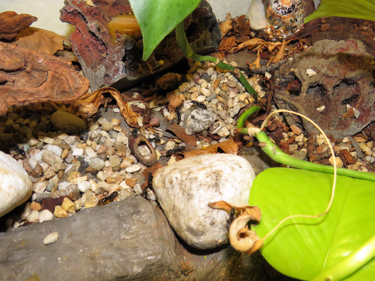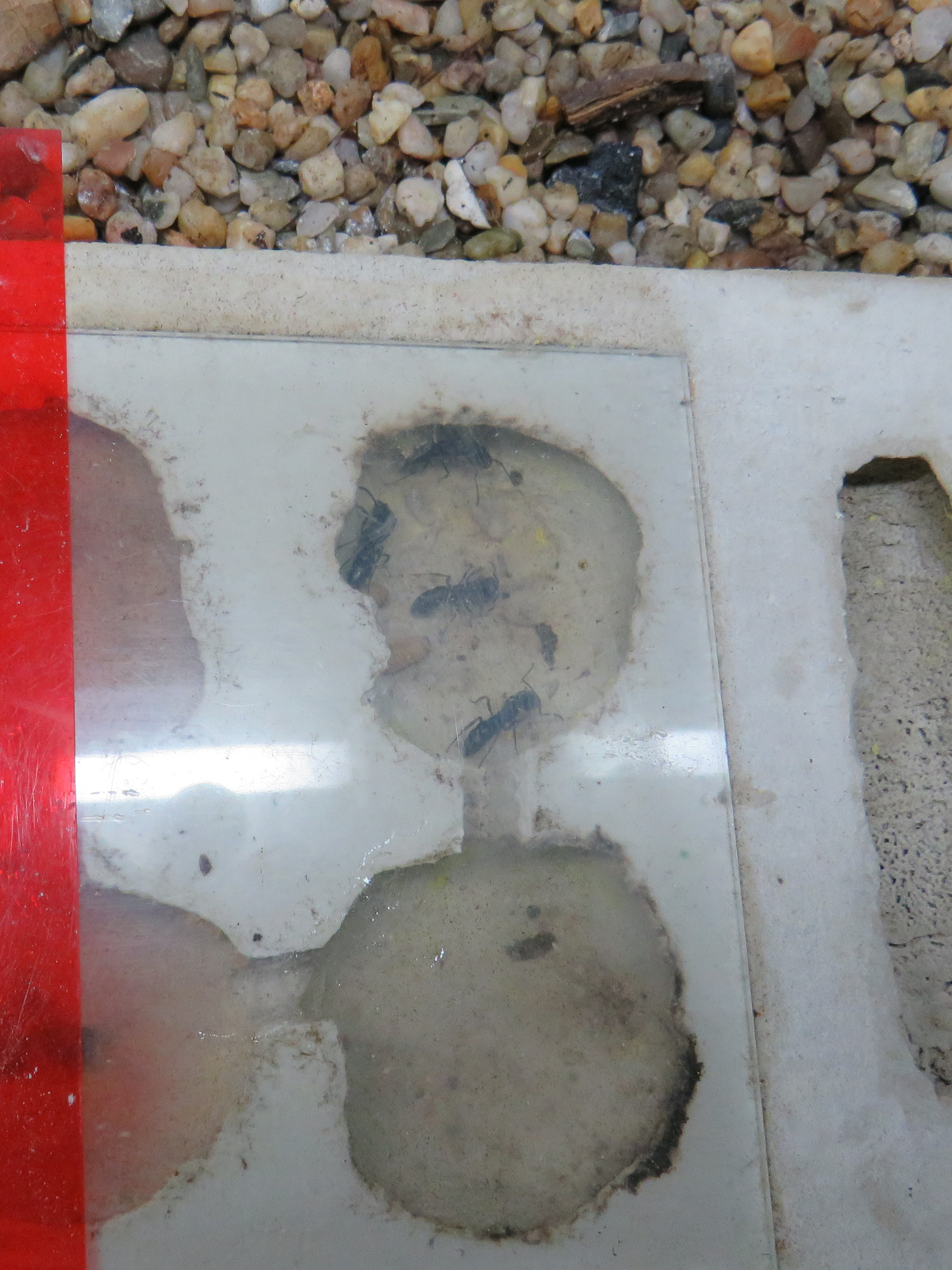 Die Kolonie entwickelt sich weiterhin gut und hat wieder eine selten dagewesene Grösse erreicht. Ich kann über 100 Ameisen zählen, obwohl keine Männchen mehr im Nest sind. Zudem halten sich bestimmt Ameisen in den Zweignestern oder in den selbstgebauten Nestetagen auf. Die Ameisen haben Wurzeln und Steine, die der Dekoration dienen, so mit Kies zugebaut, dass darunter neue Nestkammern mit mehreren krateförmigen ein und Ausgängen entstanden sind.