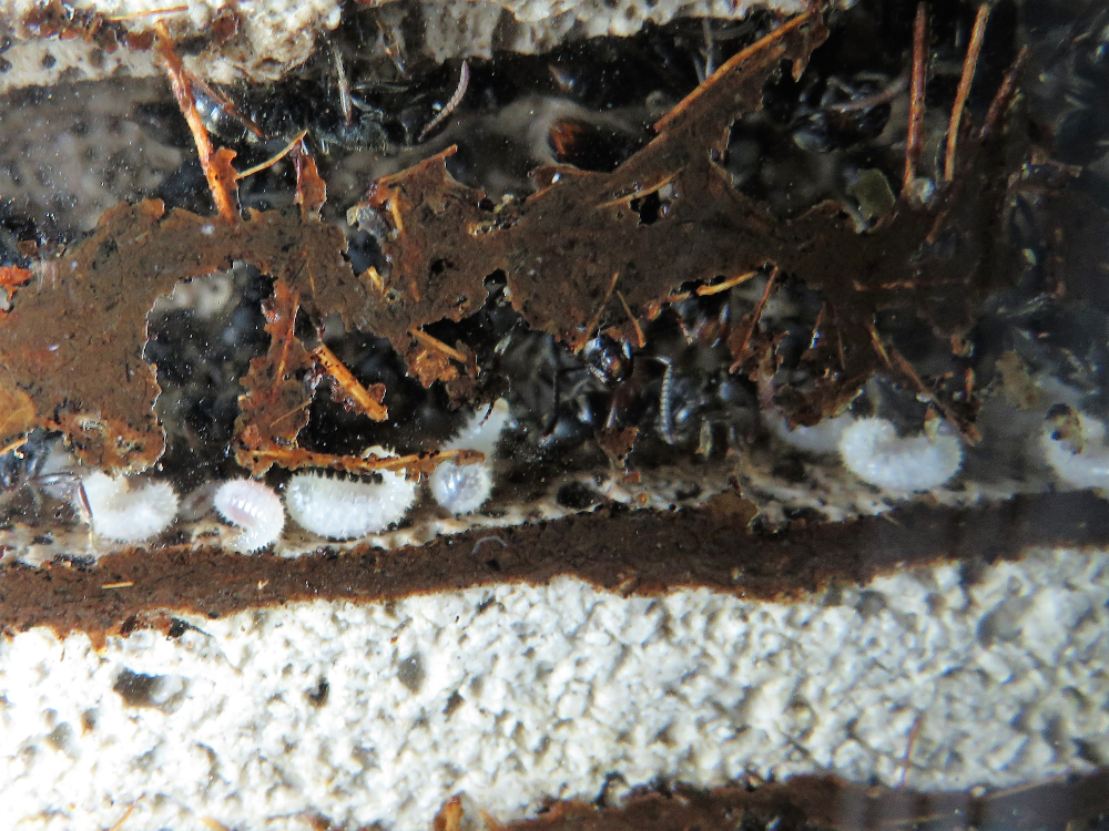 Der Zyklus geht weiter: Alle Männchen sind "verschwunden". Ebenso die Eier. Puppen und Larven in unterschiedlichster Grösse und durchschnittlicher Zahl sind noch vorhanden. Ebenso eine stattliche Anzahl von Arbeiterinnnen. Im Nest halten sich zwar weniger auf als früher, allerdings scheinen sich die Ameisen einfach in dem über dem Ytong aufgeschütteten Nestteil oder unter dem Isoliermaterial ausgehobenen Kammern zu verteilen.