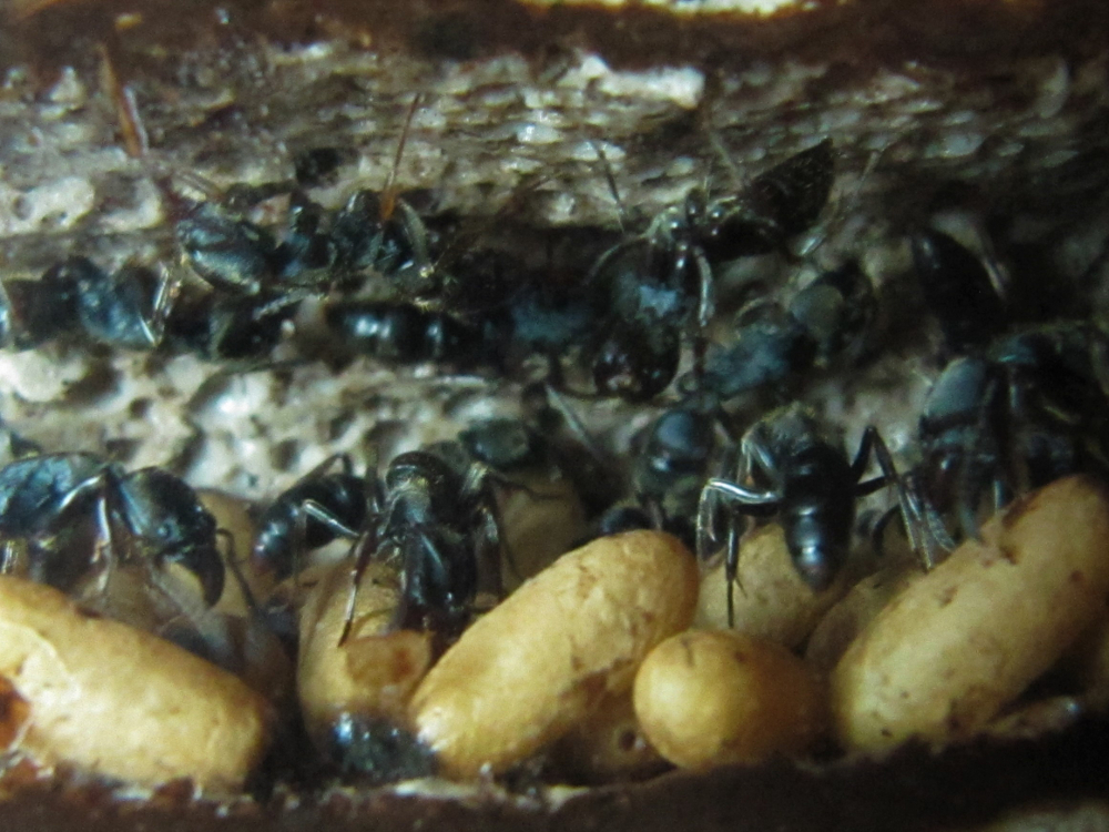 Brutmässig bricht die Kolonie gerade Rekorde, es gibt sehr viele Puppen, aber auch Larven. Zum ersten Mal überhaupt fällt mir auf, dass es dabei deutliche Grössenunterschiede gibt. Etwa fünf Puppen sind kleiner als die anderen und die früherer Tage, was mir vorerst ein Rätsel aufgibt.