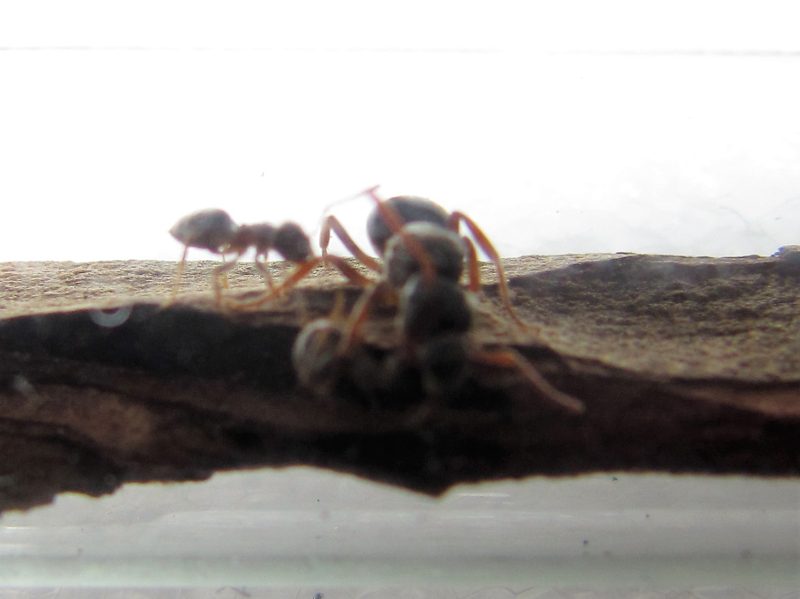 Damit die Gyne ihr natürliches Verhalten zeigen konnte, gab ich ihr eine einzelne Arbeiterin ins Reagenzglas. Ich war mir sicher, dass die Gyne diese mit Leichtigkeit überwältigen könnte. Doch nichts geschah, es gab keine Auseinandersetzung. Die Arbeiterin versuchte der Gyne aus dem Weg zu gehen, dies näherte sich interessiert. Zuerst begann die Gyne mit einem auffälligen Putzverhalten, später auch die Arbeiterin.