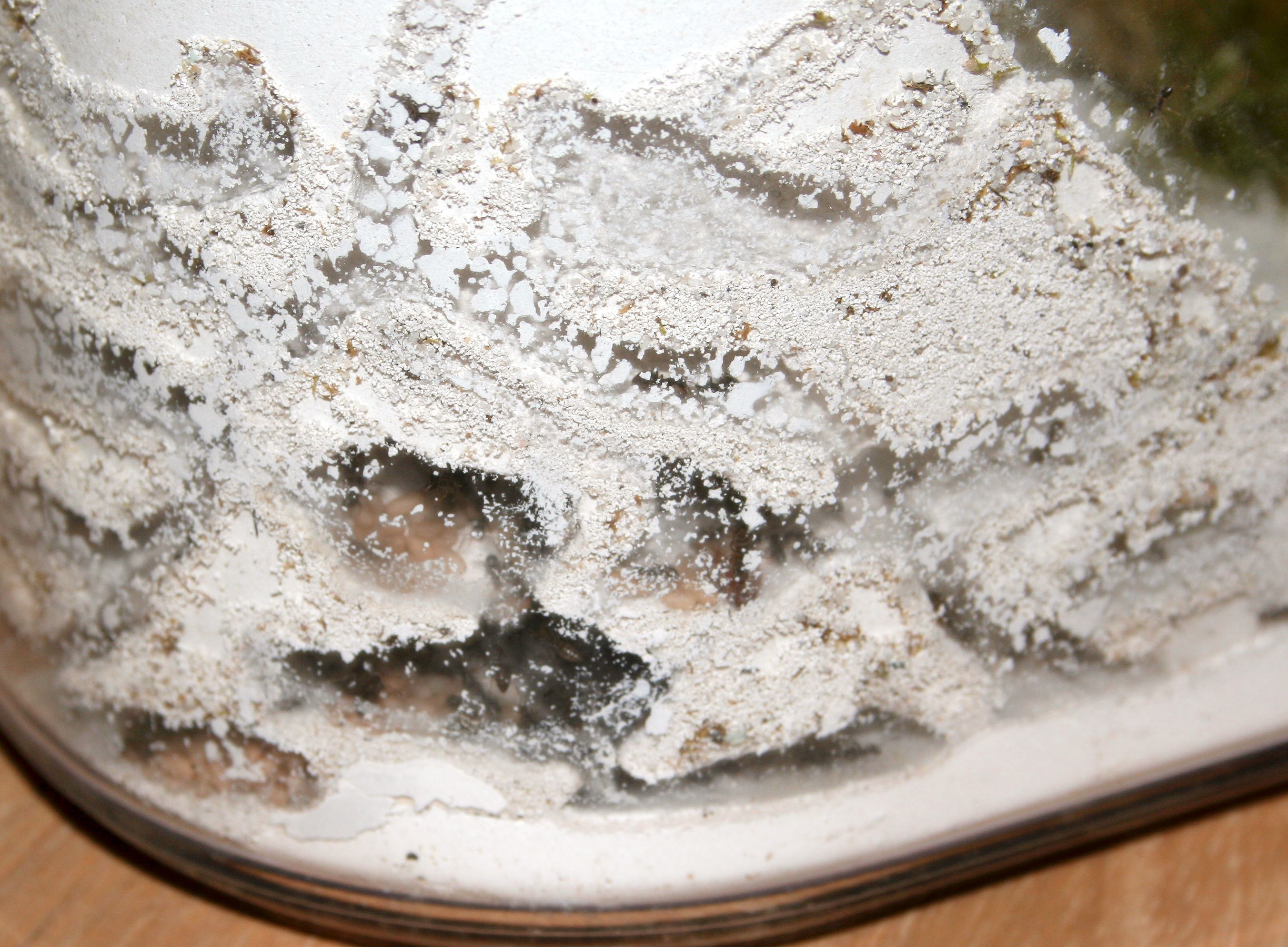 Sie leben in der Box mit dem ersten integrierten Gipsnest, was man auch erkennen kann, denn sie haben so ziemlich alles umgestaltet wie man sieht. Dafür kann man gut die Brut erkennen, die sie unten auf dem Boden der selbstgegrabenen Gänge liegen haben, wenn man das Ganze hochhebt.