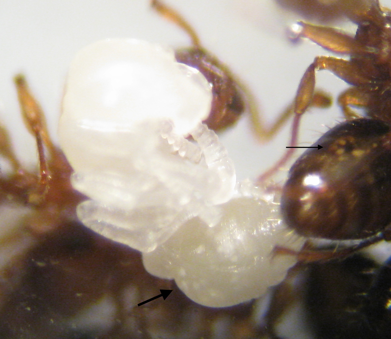 bei einer Tetramorium-Art konnte ich weiße “Punkte” bzw. Flecken in der Gaster von (hauptsächlich jungen) Arbeiterinnen und Puppen, sowie in Larven entdecken - siehe angehängte Fotos. Die Verfärbungen sind innerlich, wenn auch sehr nahe an der Oberfläche. Die Cuticula selbst ist unversehrt und an den betroffenen Stellen keinesfalls erhaben; um Ektoparasiten scheint es sich nicht zu handeln. Zu sehen sind die Flecken bei manchen, aber nicht allen, Larven, Puppen, sowie Arbeiterinnen. Innerhalb der Arbeiterinnenschaft treten sie vorrangig bei helleren, also wahrscheinlich jungen, noch nicht voll ausgefärbten Arbeiterinnen auf. Bei fouragierenden Arbeiterinnen, welche in der Regel ja älter sind, konnte ich die weißen Flecken bislang noch nicht beobachten. Bei Arbeiterinnen und Puppen sind die Flecken ausschließlich im Gaster festzustellen.