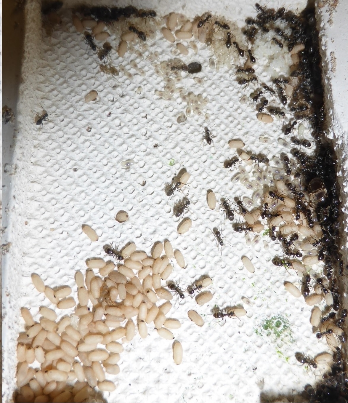 Die zweite Königin hat 2016 nicht (oder erfolglos) gegründet. Jedenfalls habe ich sie ganz ohne Arbeiterinnen und Brut trotzdem in ihrem Reagentglas überwintert. Heuer hat sie erfolgreich gegründet: Nun gibt es ca. 10 Pygmäen, viele kleine Puppen und Larven (die maximal eine Kammer in einem Gipsnest belegen würden).