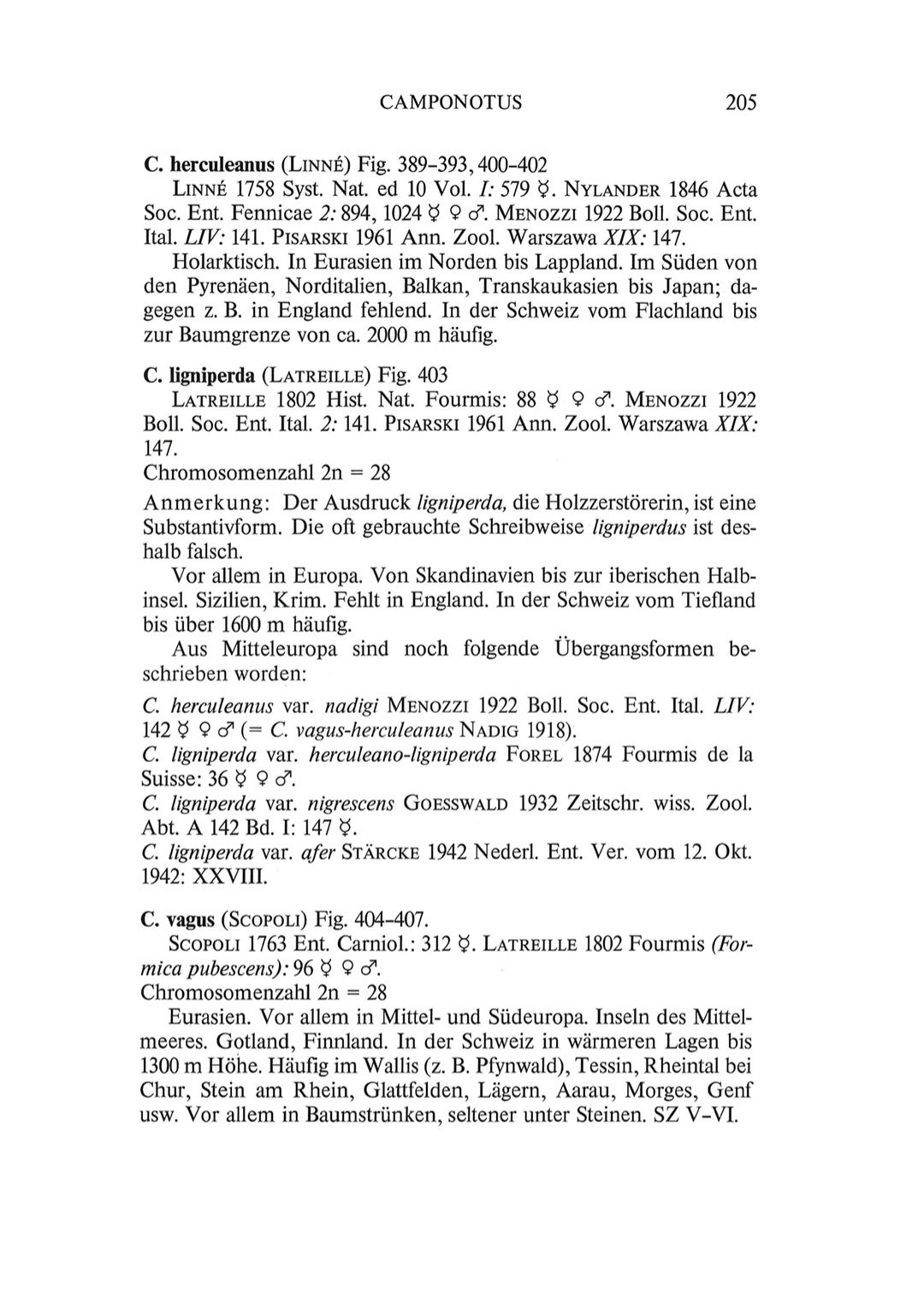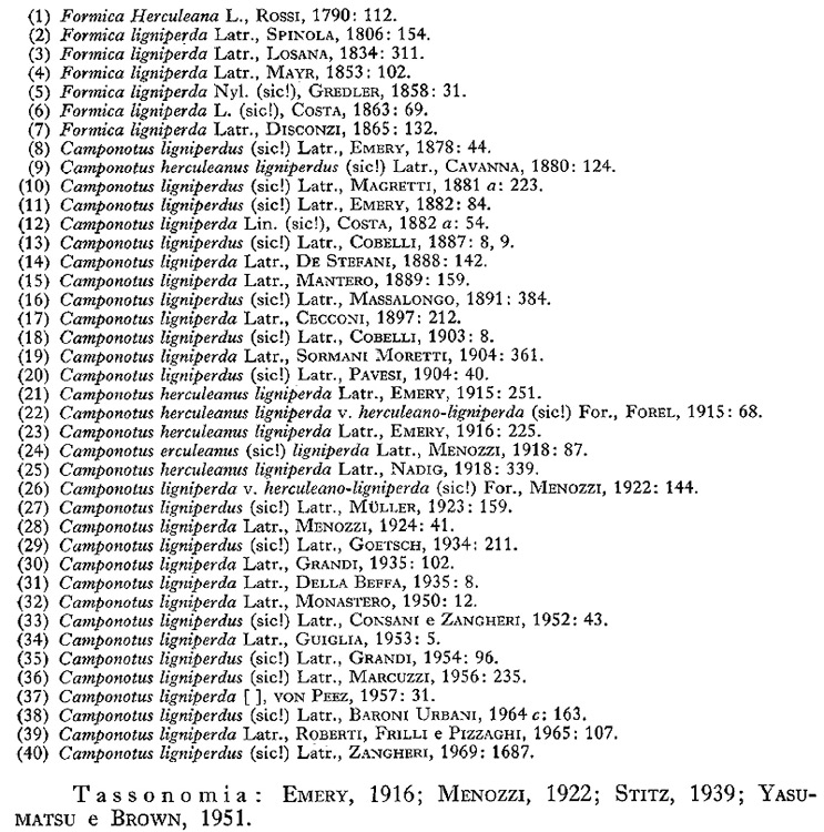 Hier ist eine Übersicht der Verwendung des Namens C. lignipera/us aus einer Arbeit von Cesare Baroni Urbani (1971):