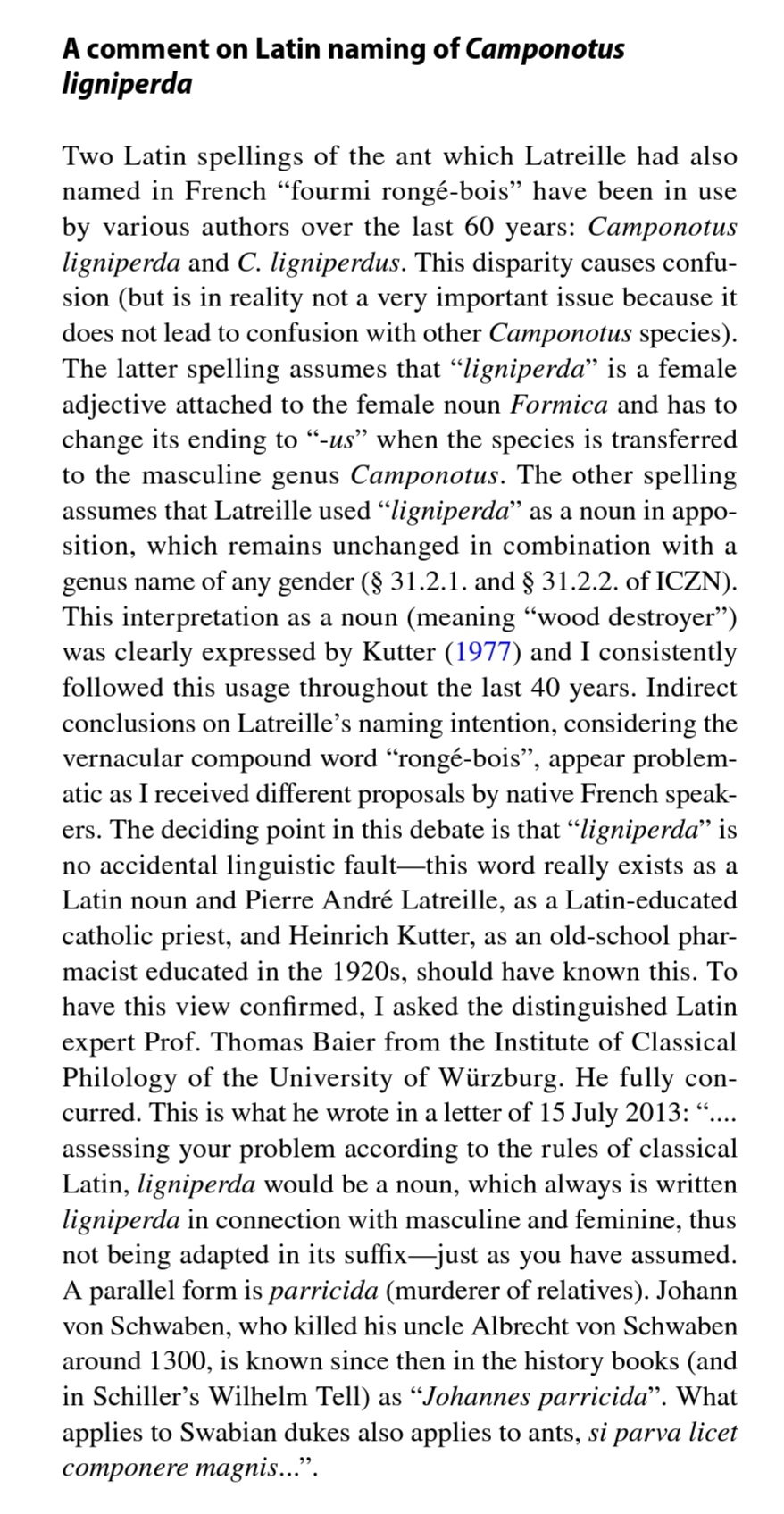 Es ist mir aus praktischen Gründen relativ egal (und ich rege mich auch nicht darüber auf), wenn jemand Camponotus ligniperdus schreibt, weil keine Verwechslung von Arten daraus entstehen kann. Vom Standpunkt des exakten Sprachgebrauches ist das aber keineswegs egal. Ich habe in dieser Frage professionelle Altphilologen konsultiert und gefragt, was denn Latreille in seiner Erstbeschreibung im Jahr 1802 mit "Formica ligniperda" gemeint haben möge. Deren Antwort war klar. Stellvertretend möchte ich die Prof. Dr. Thomas Baier, Institut für Klassische Philologie, der JMU Würzburg, Residenzplatz 2, D-97070 Würzburg in einer e-mail vom 15. July 2013 gegebene Antwort bekannt geben: