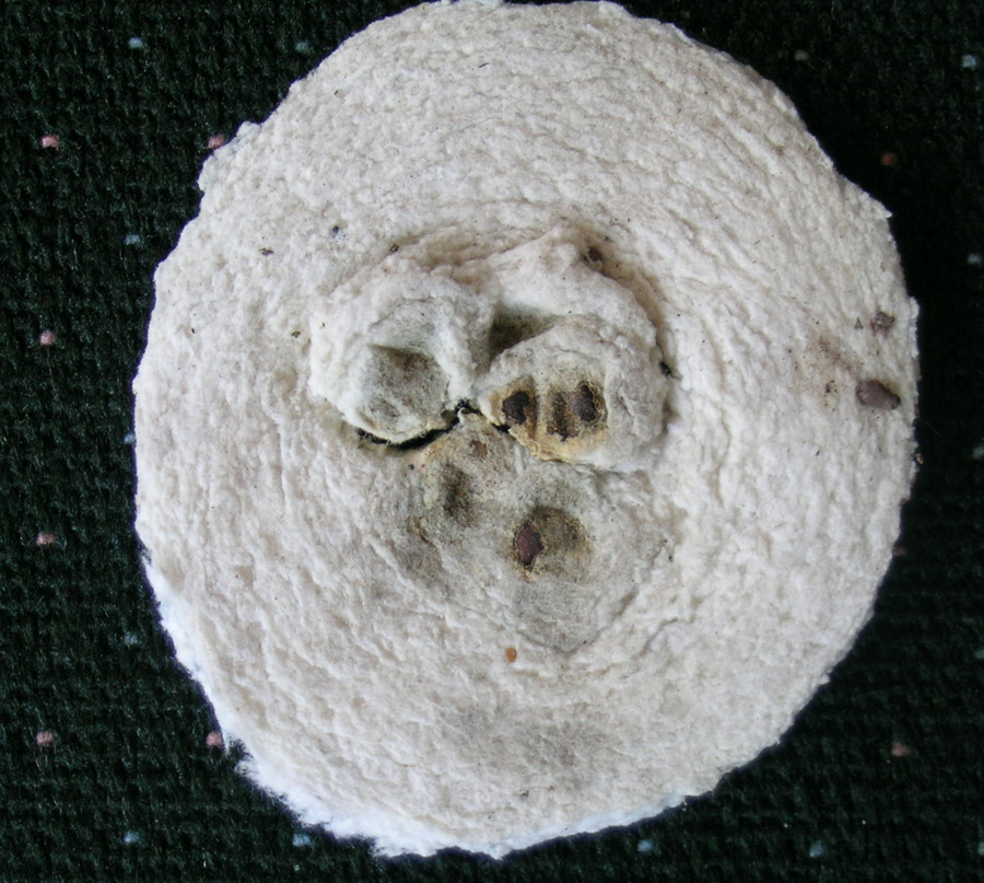Durchmesser ca. 6 cm. Es fand sich zwischen zwei Dachziegeln. (Wurde anscheinend zum Fotografieren auf ein Stück Stoff gelegt)