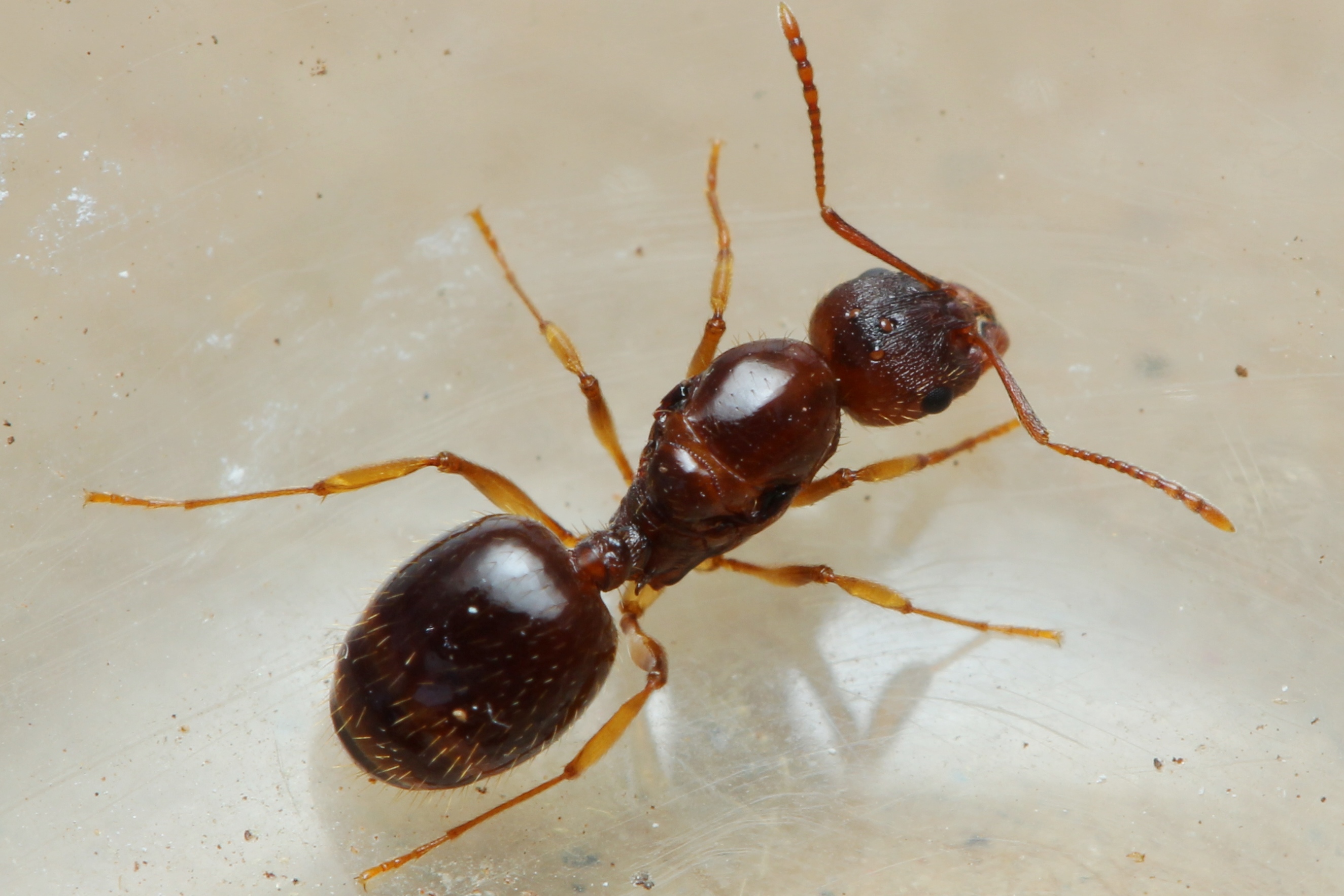 Aphenogaster subterranea ist eine seltene Art, die noch dazu vermutlich nachtaktiv ist. Vor Jahren hab ich einmal ein kleines Nest der Art gesehen, diesmal war es ein Riesennest unter einem Stein. Auf den ersten Blick dachte ich an "irgendeine" Myrmica sp., der zweite Blick brachte die Wahrheit ans Tageslicht: Äußerlich in der Größe u. Färbung wie eine Myrmica, aber der Petiolus ist auffällig lang gestielt und oberflächlich fehlt die auffallend starke "Runzelung" der Cuticula. Der Kopf ist fast glatt, vor allem Pronotum, aber auch Petiolus u. Postpetiolus erweisen sich dorsal als weitgehend glatt-glänzend. Die Gaster ist auch bei den Myrmica spp. glatt.