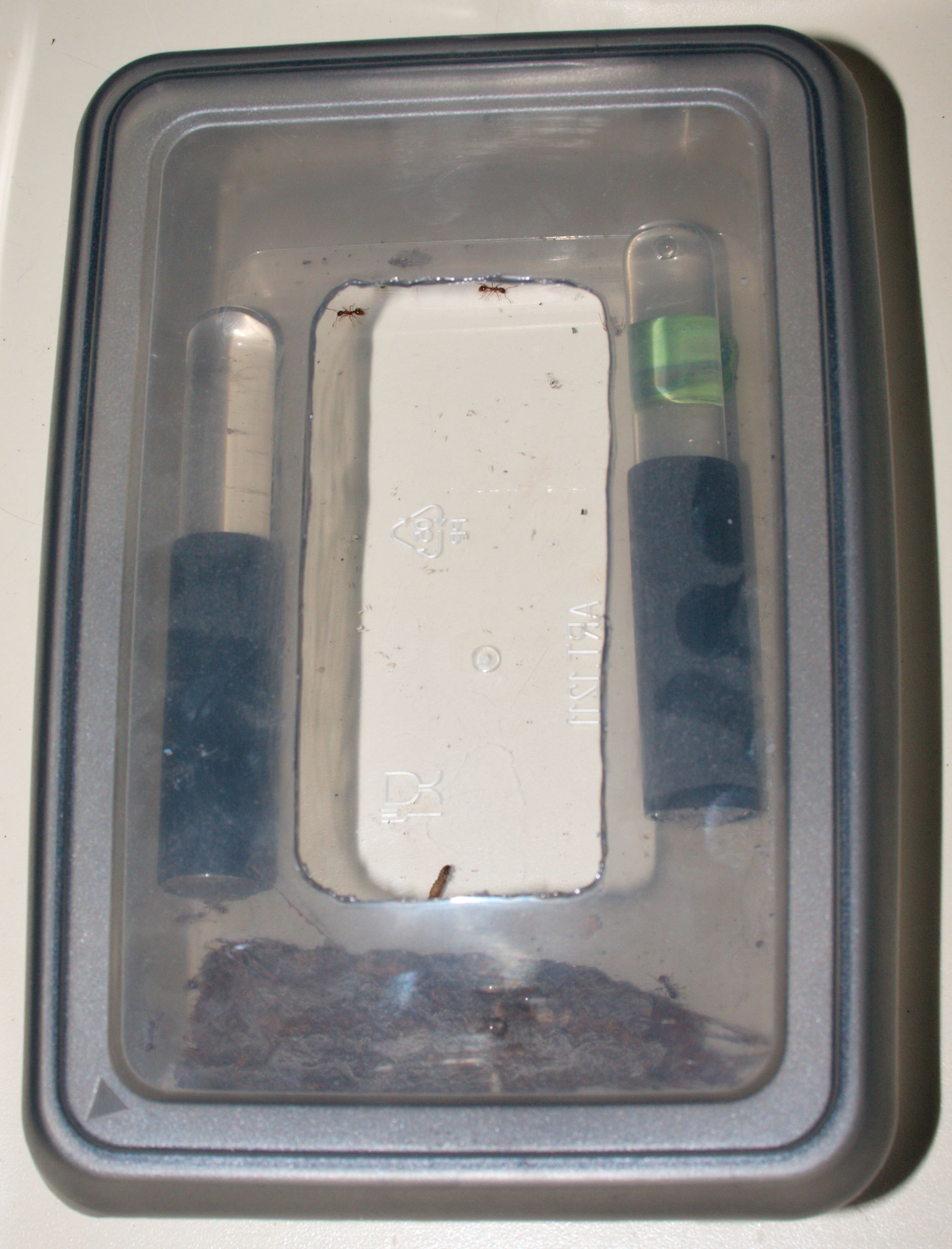 Einmal ist es die Leptothorax acervorum Kolonie, die nun wohl endgültig "ausgestorben" ist. Wie ich bereits letztes Jahr beobachten konnte, wurden es irgendwie immer weniger und zuletzt wurden auch keine Geschlechtstiere mehr gebildet. Ich denke, es wird wohl ein "natürlicher Tod" gewesen sein, also das Alter der Gyne. Immerhin war das ja ein eingesammeltes Volk.