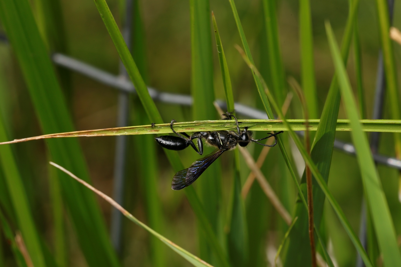 Sohn alarmiert, Bestimmungsbuch von Rolf Witt geholt: Es handelt sich um eine Nordamerikanerin, Isodontia mexicana, die sich zunehmend in Europa ausbreitet. Mir sind einige Funde aus Ostösterreich bekannt, ein, zwei Funde aus Graz in der Steiermark. Wieviele Funde es bisher in Kärnten gegeben hat, ist mir nicht bekannt. Immerhin handelt es sich um einen noch seltenen Zuzügler, der ausgerechnet in meinem Garten gefunden wird. An sich erklärbar, wenn man die Gärten der Nachbarn mit durchwegs Golfplatzrasen betrachtet. Eine Grabwespe, die nicht gräbt! Die Grashalme werden zur Abdichtung des Nesteinganges verwendet. https://de.wikipedia.org/wiki/Stahlblau ... j%C3%A4ger