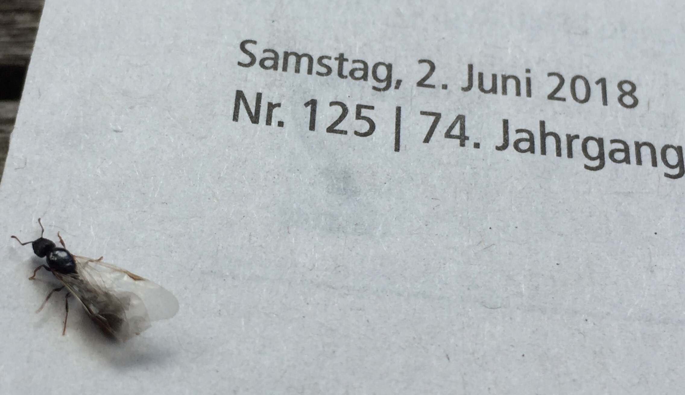 Bemerkung: 1 dealate Gyne auf der Suche nach einem Nistplatz. Die Gyne könnte von meinen 2 Nestern im Garten stammen, Formica schwärmt aber am Vormittag. Nachdem die Nester erst am Mittag Sonne bekommen, vermute ich, dass das Ausschwärmen etwas verspätet, also etwa zu Mittag stattgefunden hat.