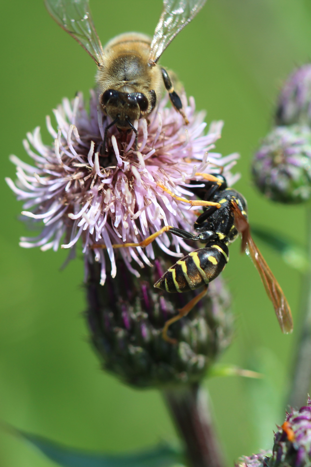 Tröpfchen; auch einige Mini-Solitärbienen sowie kleine Fliegen treiben sich da herum. Am auffälligsten aber sind die Feldwespen: