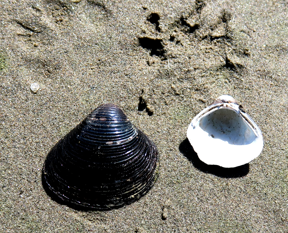 Ich interessierte mich besonders für die angeschwemmten Muschelschalen. Es gab reichlich davon, aber fast ausschließlich Schalen von Neozoen, von den „Asiatischen Körbchenmuscheln“. Corbicula fluminea und C. fluminalis sind beide bei uns seit ca. 1980 aufgetaucht, und sie sind fast weltweit verschleppt worden. Ursprünglich stammen sie aus Südostasien („China“), wurden zunächst nach Nordamerika und dann von dort nach Europa gebracht.