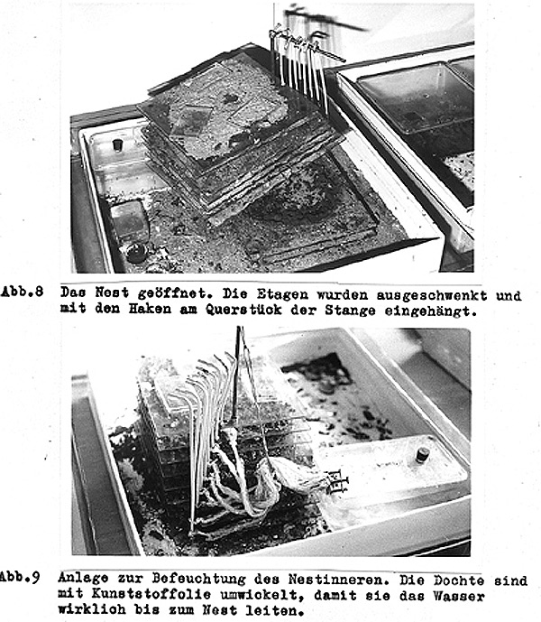 Es schien zu mühsam bzw. unsicher, jeweils Puppen aus einem Naturnest zu holen, und so kamen wir auf die Idee, ein Nest zu konstruieren, aus dem man ohne fatale Störungen immer wieder Puppen entnehmen konnte (Lasius niger ist bekanntlich hart im Nehmen!).