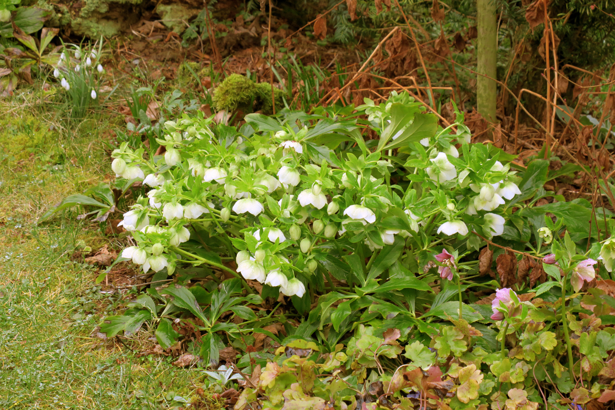 (Helleborus sp.) und die Schneeglöckchen sind da, und es sind mehr geworden. Die Stinkende Nieswurz (Helleborus foetidus) blüht wie