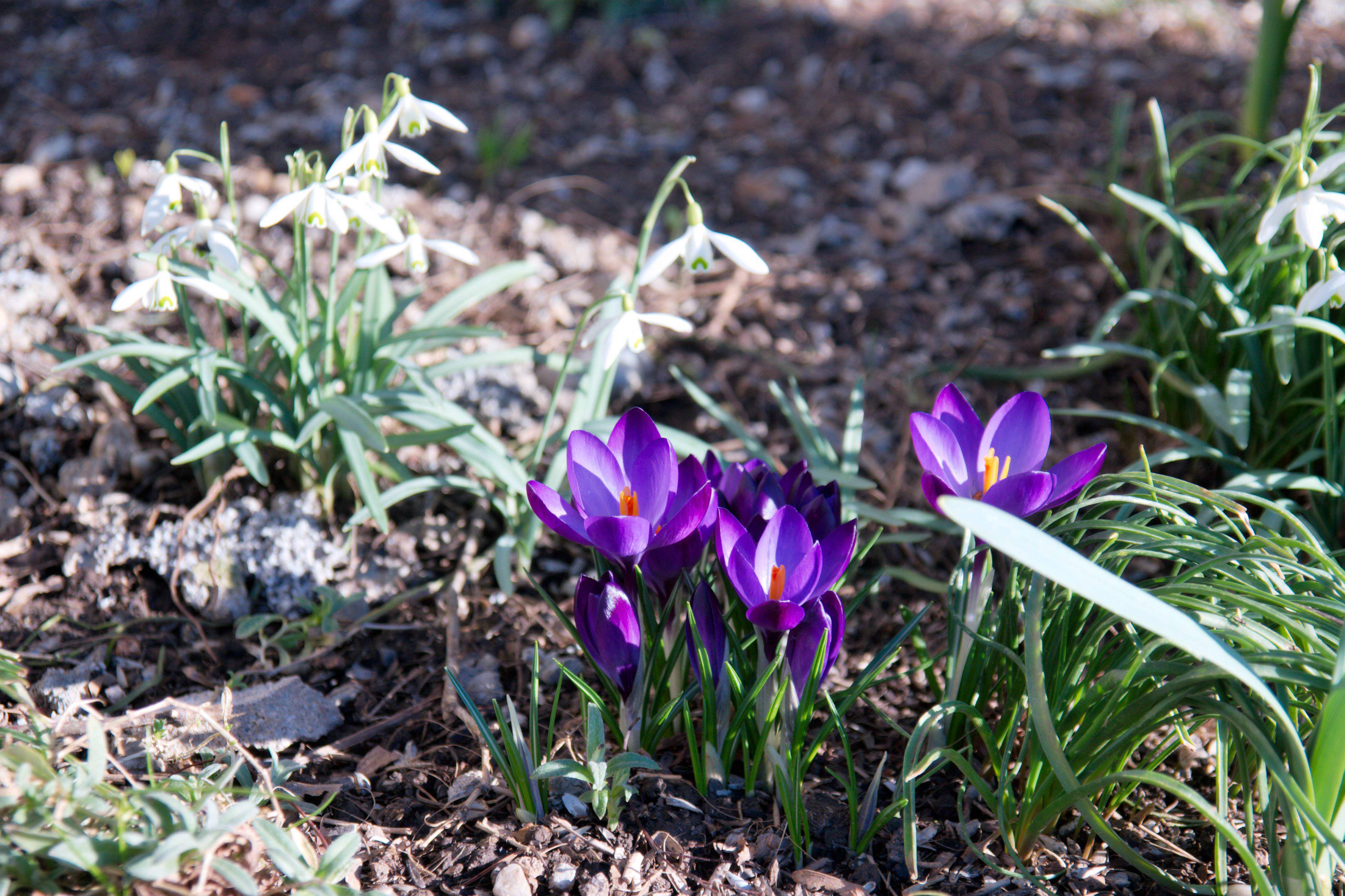 Erstaunlich üppig sind die Elfenkrokusse gekommen, willkommene Bienenweide, wenn die Sonne scheint. (Wer findet die Biene?)