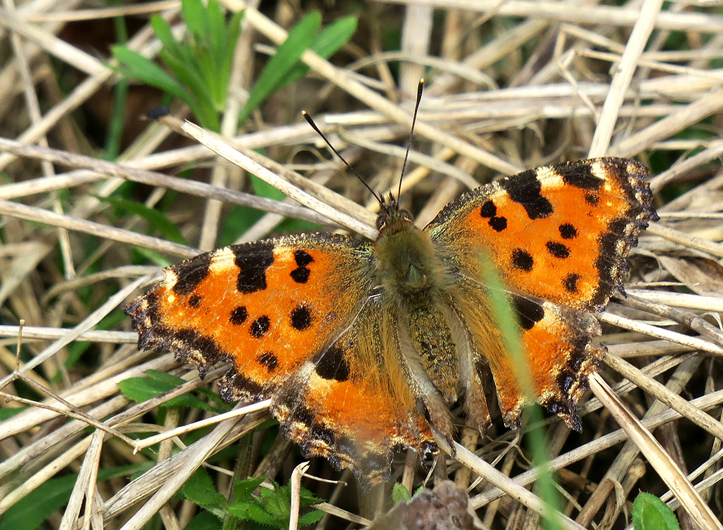 Einzelne Schmetterlinge flogen; ein Großer Fuchs sonnte sich am Wegrand. Auf die Entfernung wirkte er noch recht attraktiv, aber er war schon stark abgeflogen, hatte sicher als Falter den Winter überstanden.