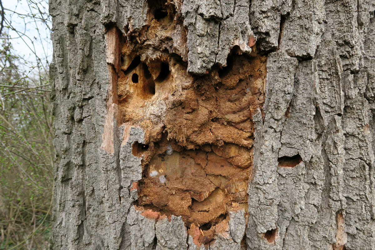 Eine der uralten Eichen war abgestorben. Von dem mächtigen Stamm, den allenfalls zwei Männer hätten mit den Armen umfassen können, war die Borke teilweise abgelöst. Daumendicke Löcher führten durch die Borke und bis ins Kernholz; auch flächige Fraßbezirke unter der Borke waren zu erkennen: Der Baum war vom Heldbock befallen, einem unserer größten Bockkäfer; die Männchen werden bis 5 cm lang und können bis 10 cm lange Fühler haben! Die Käfer sind sehr selten und gefährdet dadurch, dass ihre Wirtsbäume meist gefällt werden. In den NSGs am Rhein trifft man sie gelegentlich noch an, doch blieb uns dieses Glück versagt.