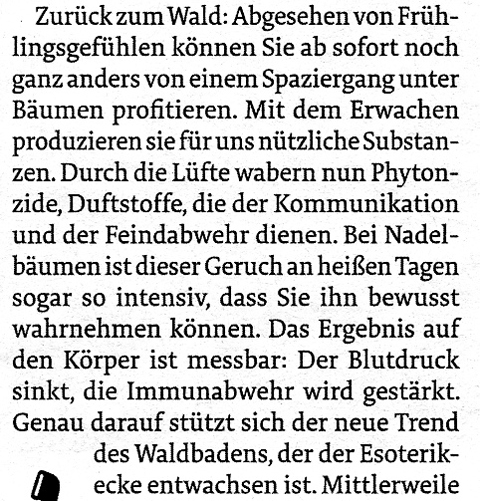 Ob diese Substanzen, die Krankheitserreger und Schädlinge der Pflanzen abtöten oder abwehren, für den Menschen wirksam sein können, sei dahingestellt. Dass das modische „Waldbaden“ wirklich der Esoterikecke entwachsen ist, darf man bezweifeln. - Schön und erholsam ist der Aufenthalt im Wald und in der freien Natur zweifellos, auch ohne pseudowissenschaftliche Begründungen!