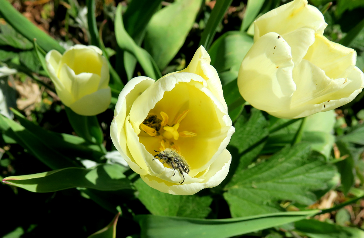 Eine spät blühende, hellgelbe Tulpensorte hat große Anziehungskraft für Tropinota hirta.
