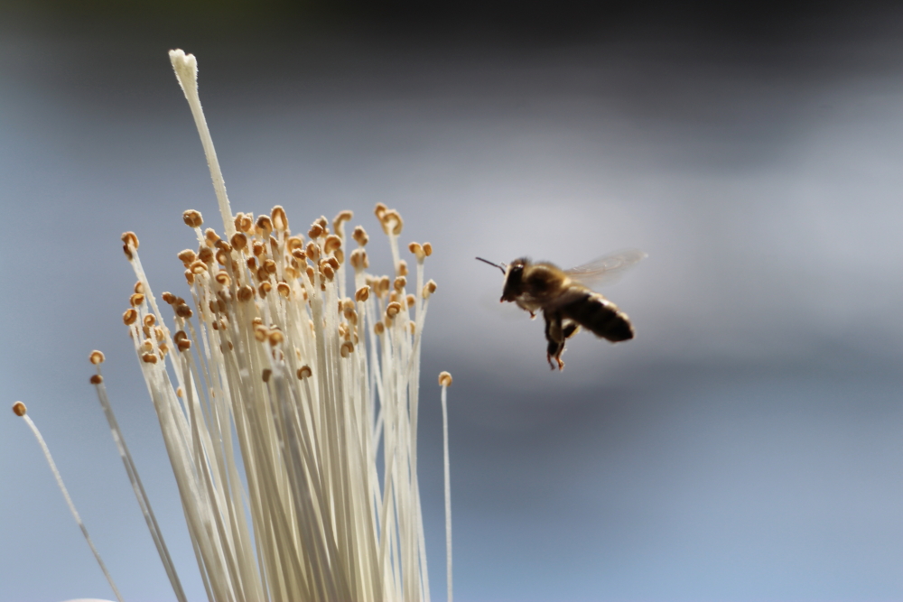 Interessant, wie eine Honigbiene die unbekannte Riesenblüte geduldig erforscht.