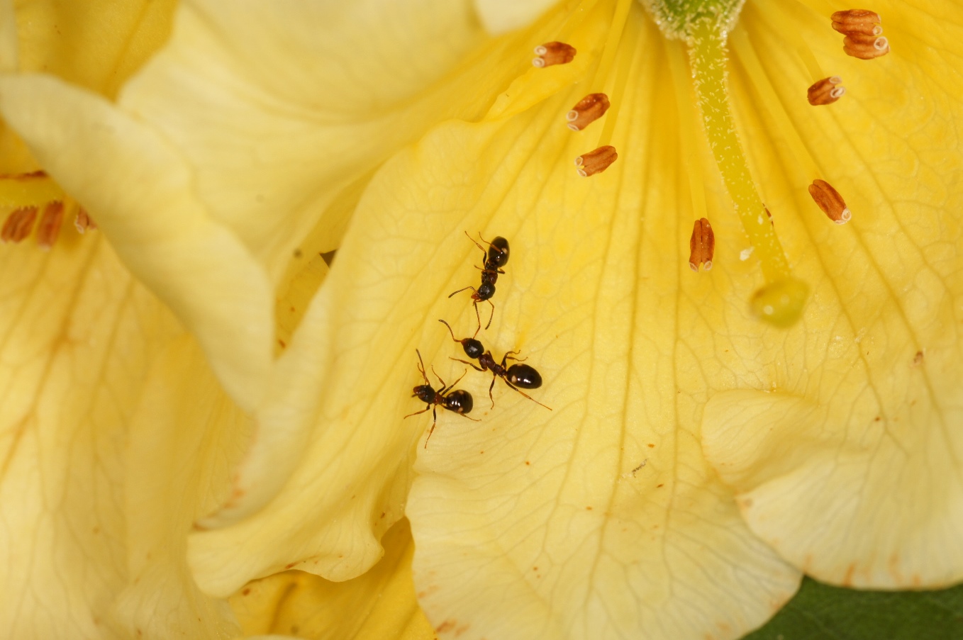 Ich habe schon einmal darauf hingewiesen, dass mein gelber Rhododendron stark von Bienen beflogen wird : viewtopic.php?f=50&t=79&start=1360#p20486 Ich habe einst zahlreiche Pflanzen von der berühmten Gärtnerei Hobbie bei Hamburg bezogen, Direktimport aus der damaligen EWG, Österreich war bei der EFTA; also mit Verzollung etc. Es sind jetzt 30 Rhododendren im Garten, aber diese Pflanze R. hotei wird - ich kann sagen - ausschließlich von Bienen besucht. Bei den restlichen Arten sieht man selten eine Biene, fast nur Hummeln. Warum das so ist, weiß ich nicht, wird vielleicht an einem eigentümlichen Geschmack/Geruch des Nektars liegen. Dieser ist übrigens reichlich vorhanden, in manchen Nächten tropft er auf darunter liegende Blüten oder Blätter. Ach ja - Ameisen mögen den Nektar auch, vor allem der allgegenwärtige Dolichoderus quadripunctatus.