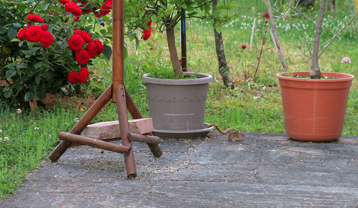 Das Loch an der Hauswand unter die Terrasse war mir schon aufgefallen. Am Tag dort eingesteckte Gänseblümchen waren am Abend weg geräumt.