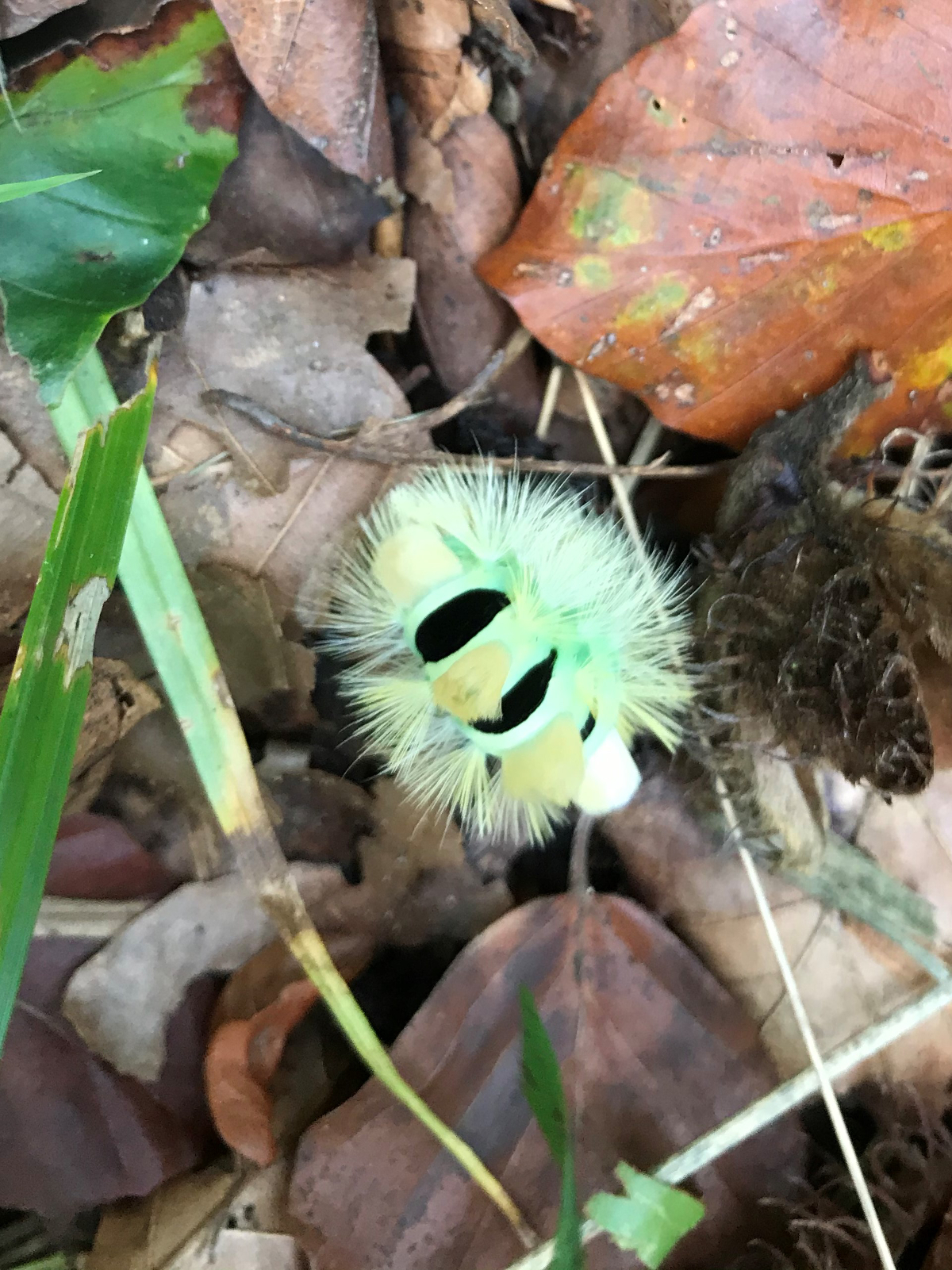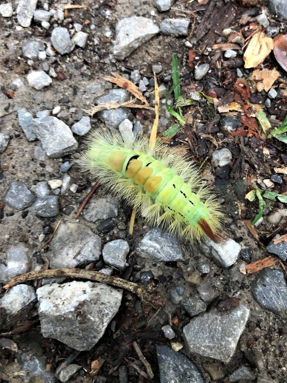 Das ging ja fix. Absolut richtig! Es handelt sich um die exotisch gefärbte, grüne Variante einer Raupe des Buchen-Streckfuß (Calliteara pudibunda), daneben existiert noch eine rote Variante. Die Raupen ernähren sich von verschiedenen Laubbaumarten, häufig von Buchen. Sie rollen sich bei Gefahr zusammen. Zur Zeit verpuppen sich am Boden um dort zu übewintern. Aus den auffälligen Raupen entsteht im nächten Frühjahr ein unscheinbar gefärbter Nachtfalter.