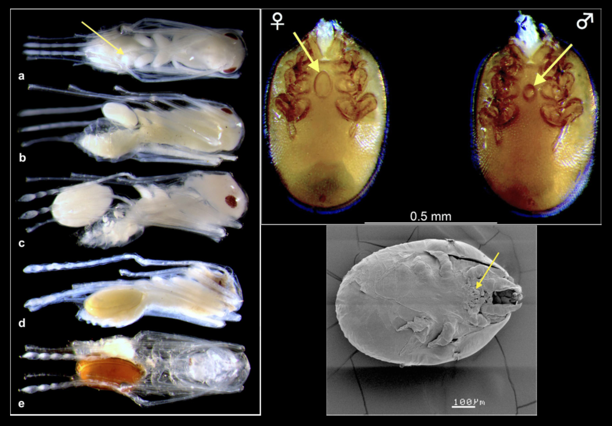 (a) Feeding mite larva anchored (see arrow) on the underside of the third left coxa of a worker pupa; (b) mite protonymph on half-depleted ant host gaster; (c) mite deutonymph on an almost empty host gaster; (d) host gaster totally occupied by the fully grown deutonymph; (e) teneral pigmented adult mite on fully drained, unviable host worker pupa. Photos: H. Bahena Basave.