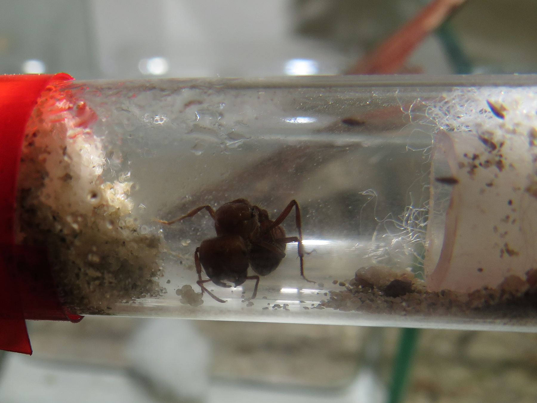 Ein putzmunteres Tier kam Mitte Oktober bei mir an. Das Reagenzglas wurde mit roter Folie versehen und bei 26 °C untergebracht. Allerdings war die Gyne während Tagen so aktiv die Watte auf beiden Seiten der Gründungskammer am Bearbeiten, dass ich mir Sorgen machte. Denn sie tat das so erfolgreich, dass ich erstens Angst hatte, dass sie sich zum Wassertank durchbeisst und zweitens, dass sie zu viel Energie verbraucht, drittens kamen mir sogar Zweifel, ob die Art wirklich claustral gründet…