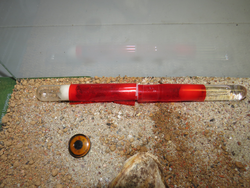Nun bot ich ein zweites Reagenzglas an. Wieder mit roter Folie abgedunkelt und mit einem verkleinerten Eingang über ein Stück Schlauch, der in einer Ecke endete, wo die Gyne öfters grub. Dieses Mal füllte ich aber den Reagenzglas-Boden und den Schlauch fast zu einem Drittel mit leicht angefeuchtetem Sand. Das RG legte ich so in die Arena, dass der Teil mit dem Wassertank noch bei 30°C beheizt wurde, der Nestteil aber ausserhalb der Heizmatte zum Liegen kam. Das Thermometer zeigt unmittelbar auf dem Kiesboden neben dem Nestkammer ca. 28 °C an.