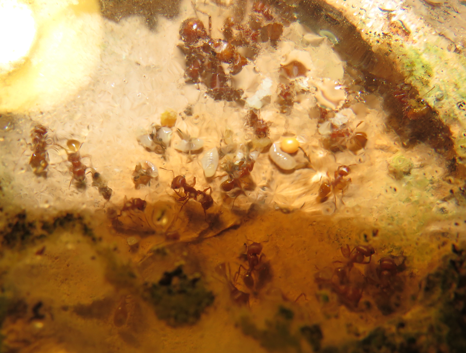 Zwei Jahre nach der Gründung ist die Kolonie vor wenigen Wochen erstmals aus zwei Reagenzglasnestern in ein Gipsnest umgezogen. Das erlaubt mir eine etwas bessere Nesteinsicht.