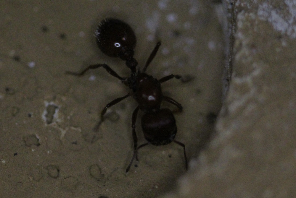 Das abgedunkelte Reagenzglas habe ich in ein kleines Becken mit Sandboden gelegt. Auf den Reagenzglasboden habe ich ebenfalls ein wenig Sand gefüllt. Der Eingang wurde mit einem Wattestopfen und einem kleinen Röhrchen verengt. Das Becken stand auf einer Terrarienlampe. Direkt auf der Lampe wird es tagsüber genau 30,4 Grad warm. Im Becken selber noch ca. 29 °C. In der Nacht sinkt die Temperatur auf 23 °C ab. Die Königin blieb wärend der ganzen Zeit in ihrer Gründungskammer, ob sie sich ohne Arbeiterin claustral oder semiclaustral verhalten hätte? Die Pygmäe hat jedenfalls - meistens Nachts - kleine Touren unternommen und Körnchen (Chia-Samen) und später vereinzelt tote Essigfliegen eingetragen. Anfangs hat sie sich vor den toten Fliegen sogar gefürchtet und ist ihnen aus dem Weg gegenagen. Sowohl die Gyne als auch die Arbeiterin verschlossen den Eingang von innen mit Sandkörnchen und Watteteilchen.