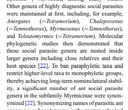 Seifert, B., Buschinger, A., Aldawood, A., Antonova, V., Bharti, H., Borowiec, L., Dekoninck, W., Dubovikoff, D., Espadaler, X., Flegr, J. , Georgiadis, C., Heinze, J., Neumeyer, R., Ødegaard, F., Oettler, J., Radchenko, A., Schultz, R., Sharaf, M., Trager, J., Vesnić, A., Wiezik, M., Zettel, H., 2016, “Banning paraphylies and executing Linnaean taxonomy is discordant and reduces the evolutionary and semantic information content of biological nomenclature.” Insectes Sociaux, vol. 63, no. 2, p. 237-242.