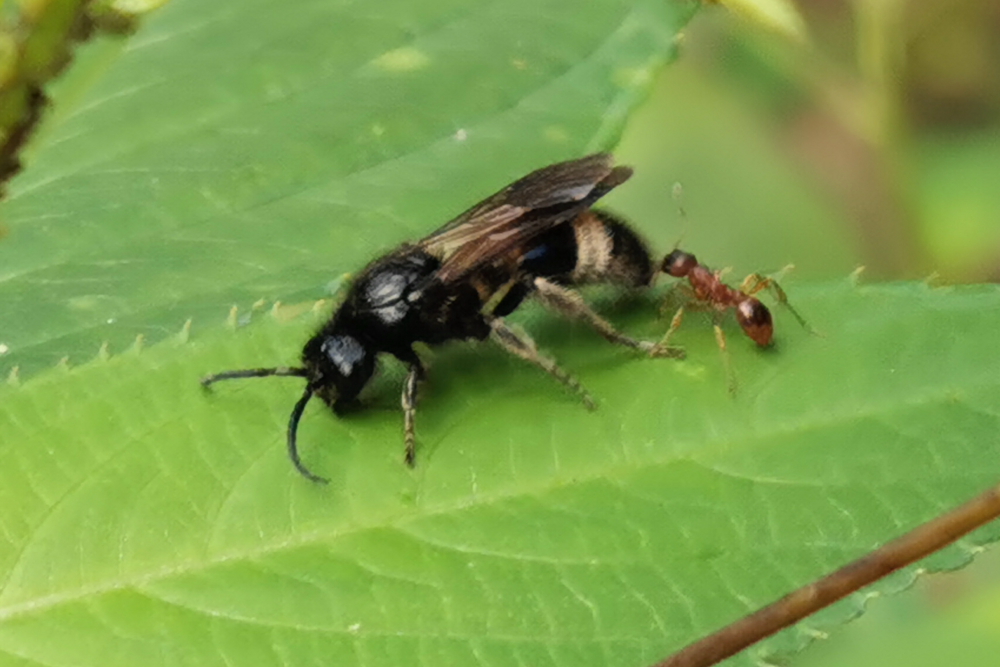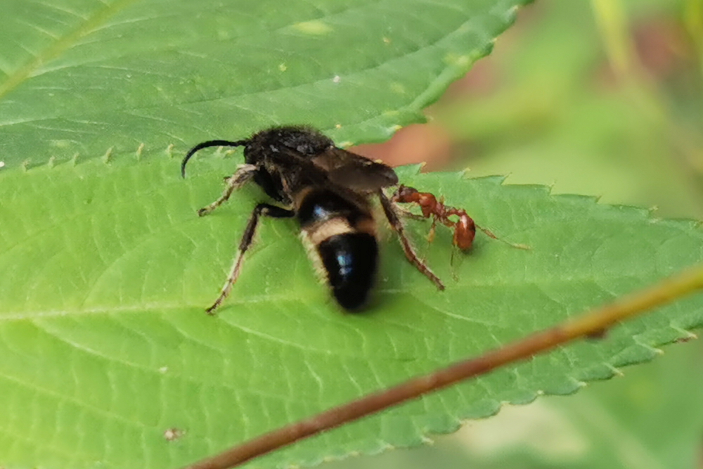Das selten zu sehende Männchen der Ameisenwespe Mutilla cf. marginata war in der kühleren Abendstunde verlangsamt noch auf Springkraut unterwegs, eventuell auf der Suche nach geeignetem Schlafplatz. Eine Myrmica-Arbeiterin dagegen noch voll agil, verfolgte, bedrängte und biss das imposante Tier andauernd.