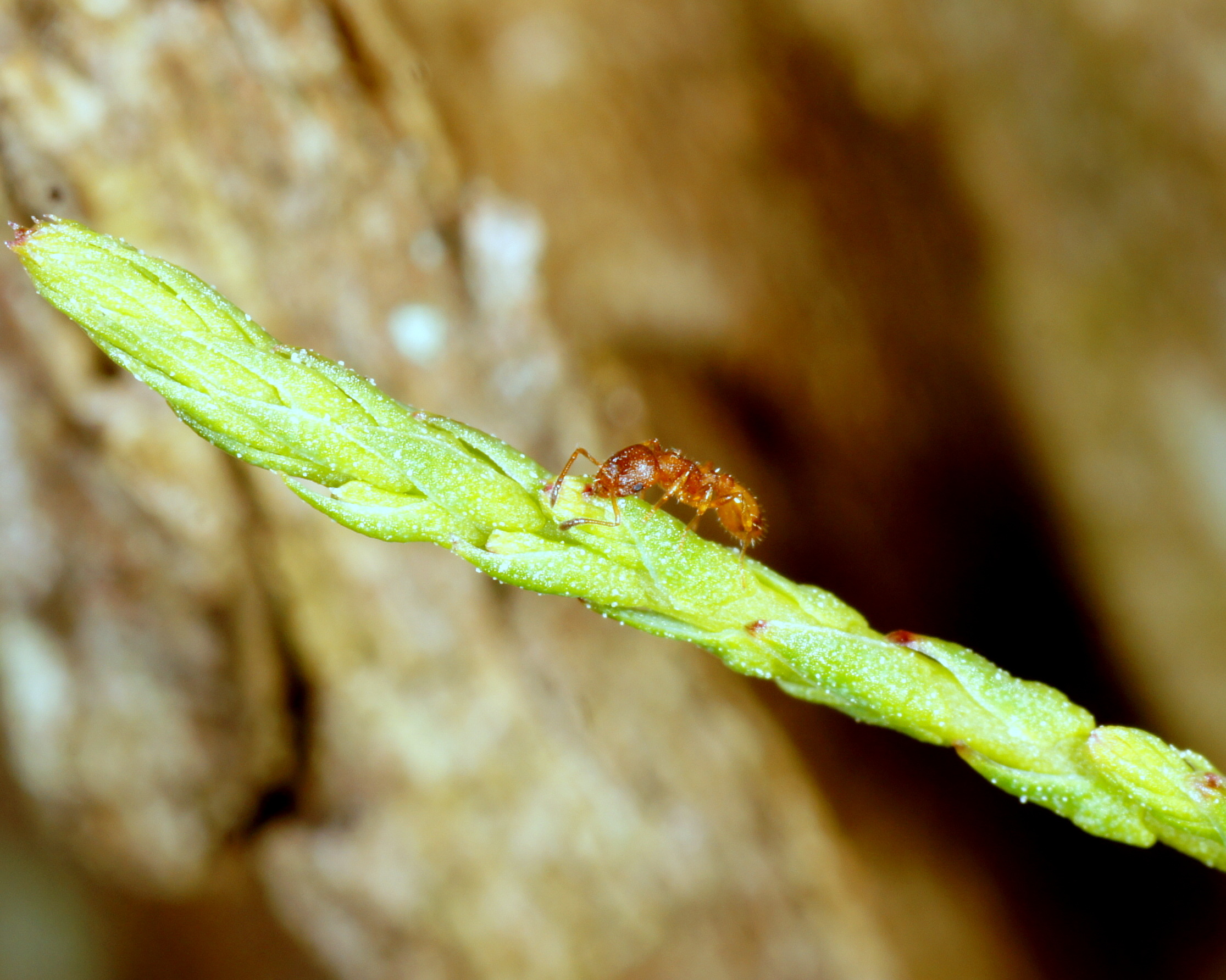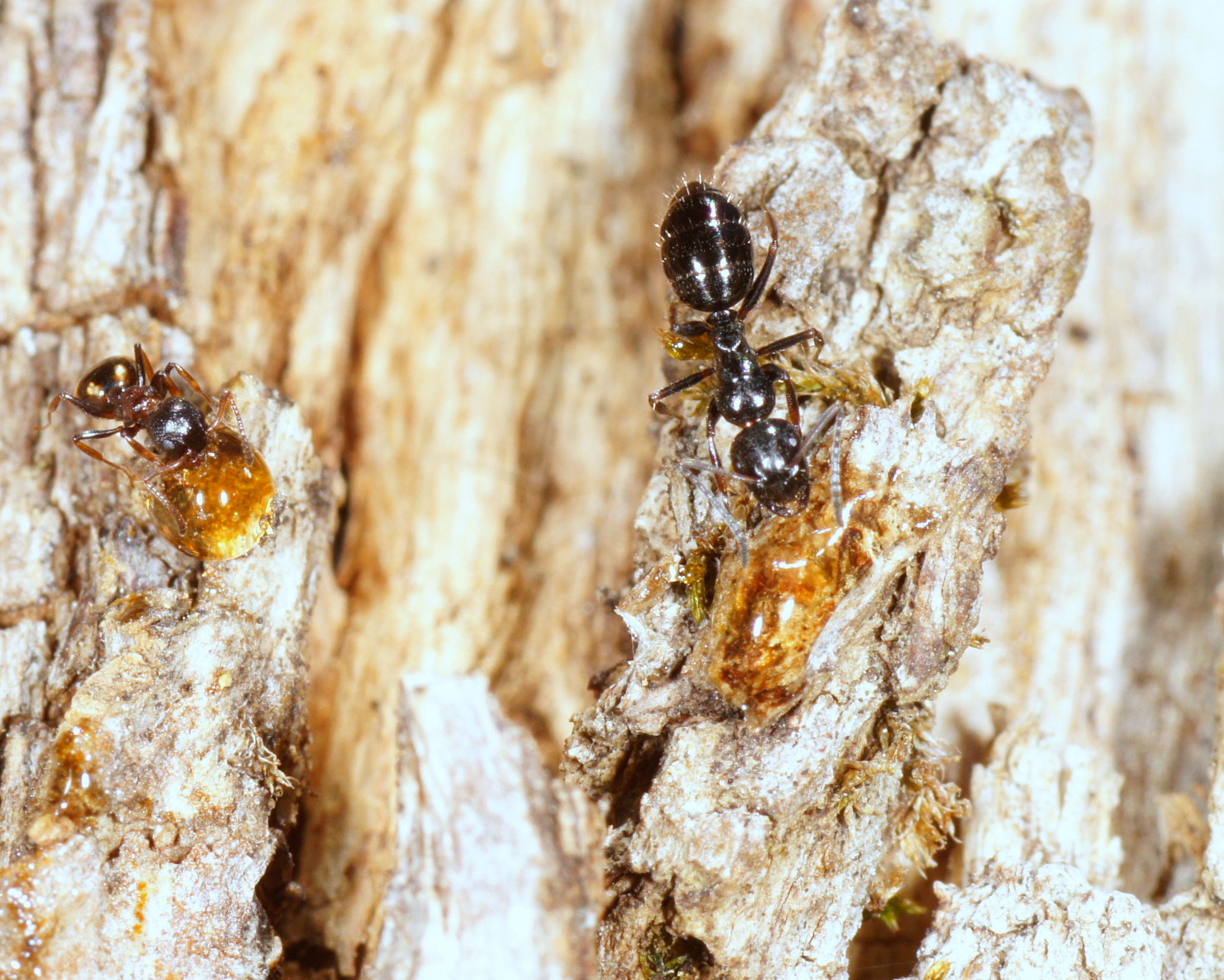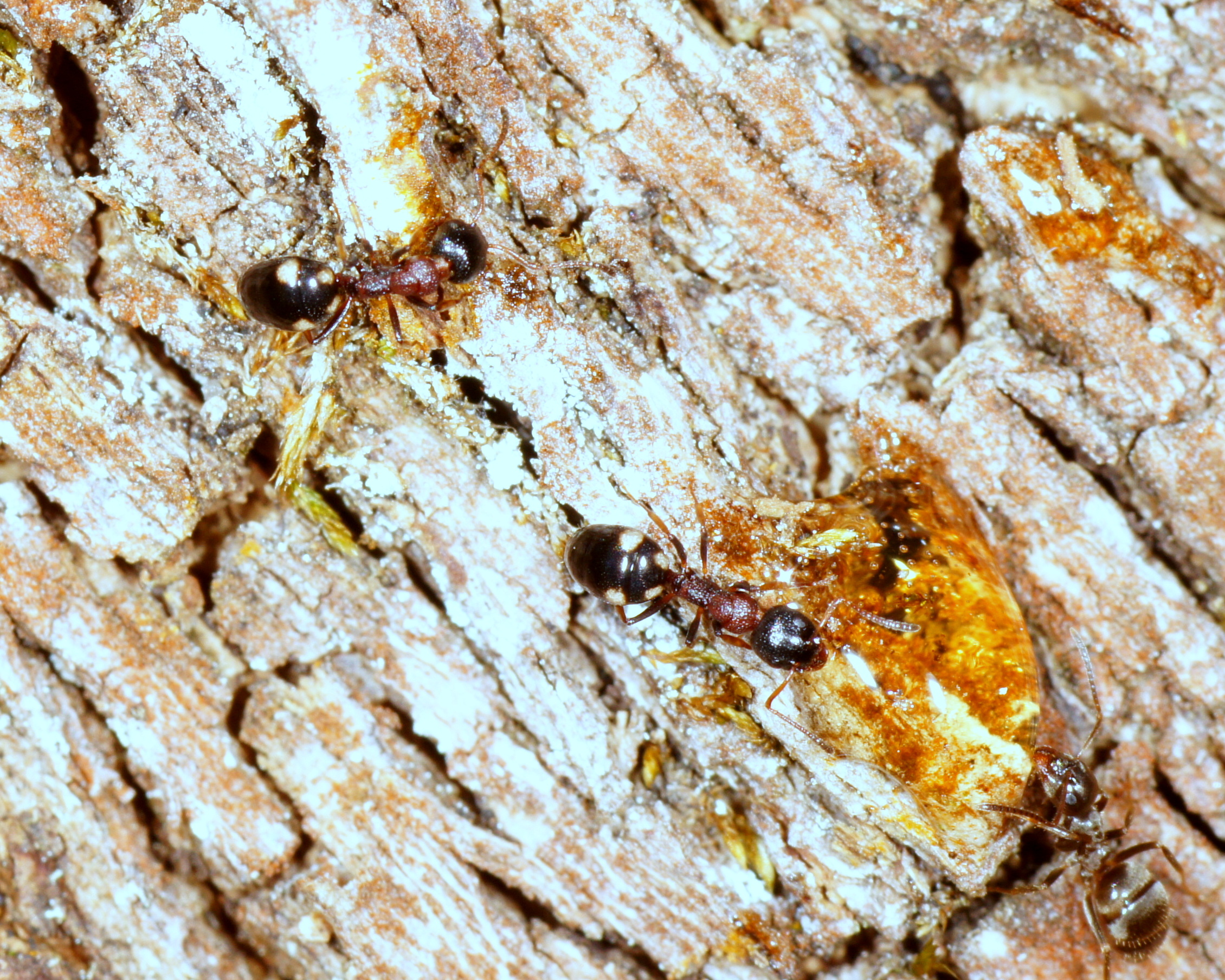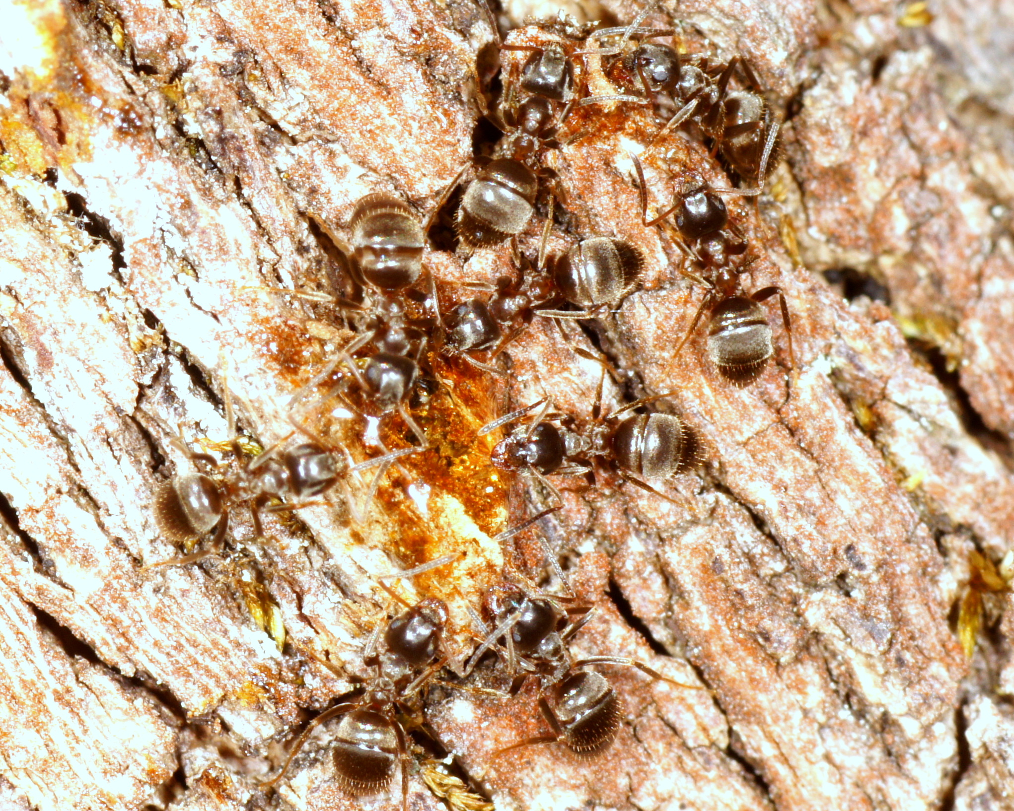 Auch Temnothorax wurde mit Ahornsiruptröpfchen angelockt. Interssant: Ein Dolichoderus, sonst eher scheu und zurückhaltend, hat eine Temnothorax einfach gepackt und weggeworfen!