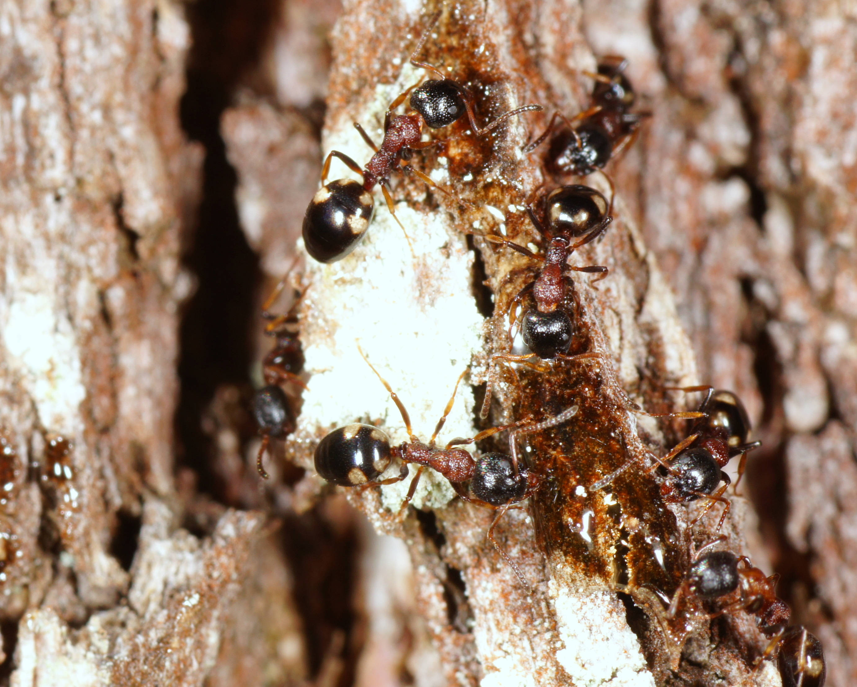 Camponotus piceus am Stamm, links ist ein Dolichoderus quadripunctatus noch zu erkennen. Das spätere Erscheinen einer Lasius niger-Arbeiterin löst bei C. piceus abrupte Flucht aus.