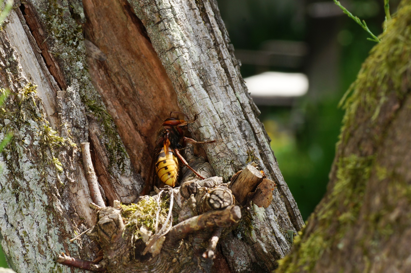 Foto vom Vorjahr: Hornissen verwenden morsches Holz für den Nestbau (hier eine Königin); zwei Äste haben sie vollkommen ausgehöhlt. Sie kommen von weit her, morsches Holz gibt es in der Stadt kaum!