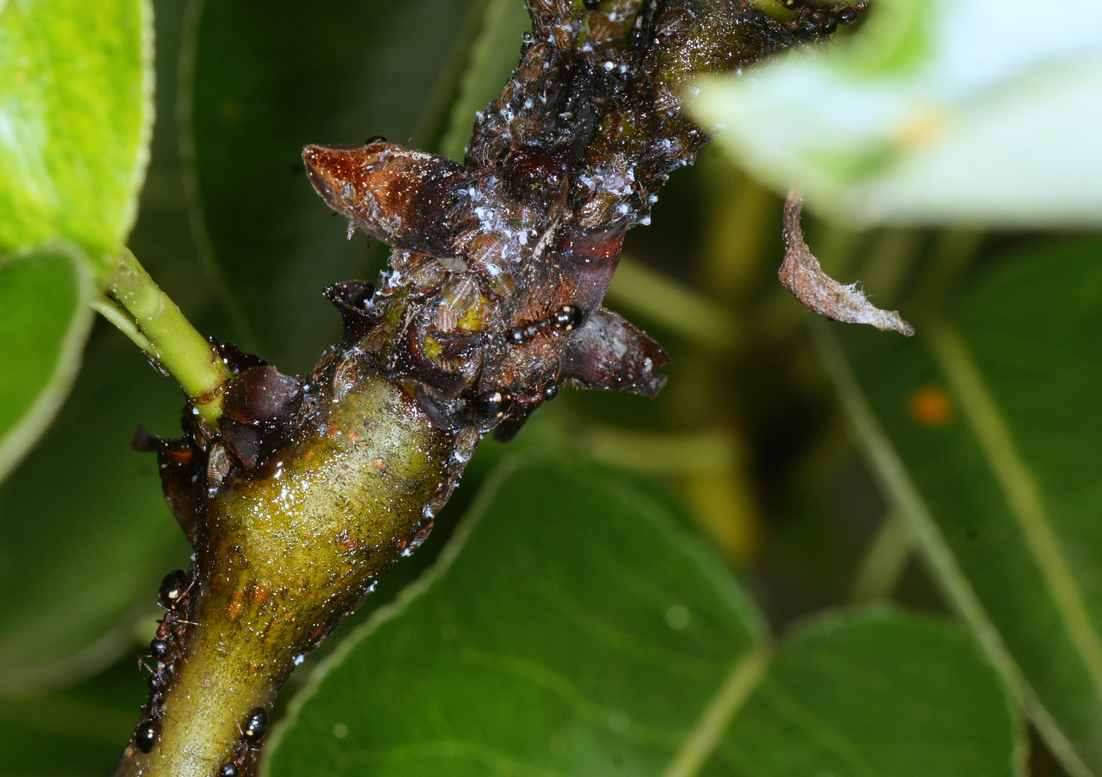 Die Läuse haben sich dicht um das Ästchen postiert