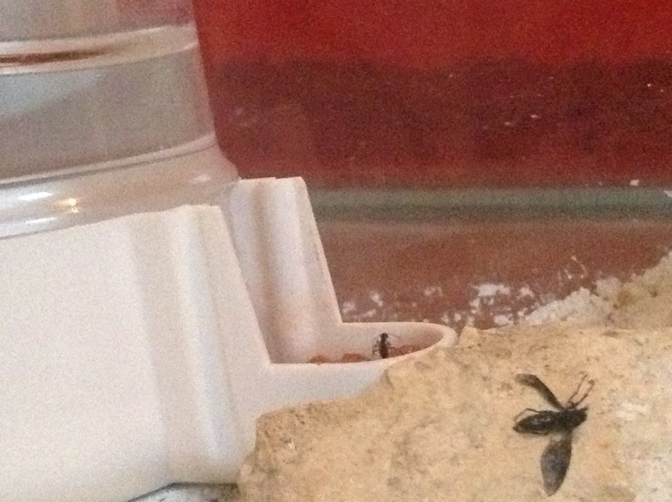 Weil meine Ameisen immer nur im Nest sind (95% des Tages und der Kolonie) was eigentlich verständlich ist, biete ich ihnen gleich eine Spinne einen Marienkäfer eine Fliege (Sie lieben Hausfliegen) und frisches Zucker-Wasser. Dazu aber mehr in meinem Nächsten bericht