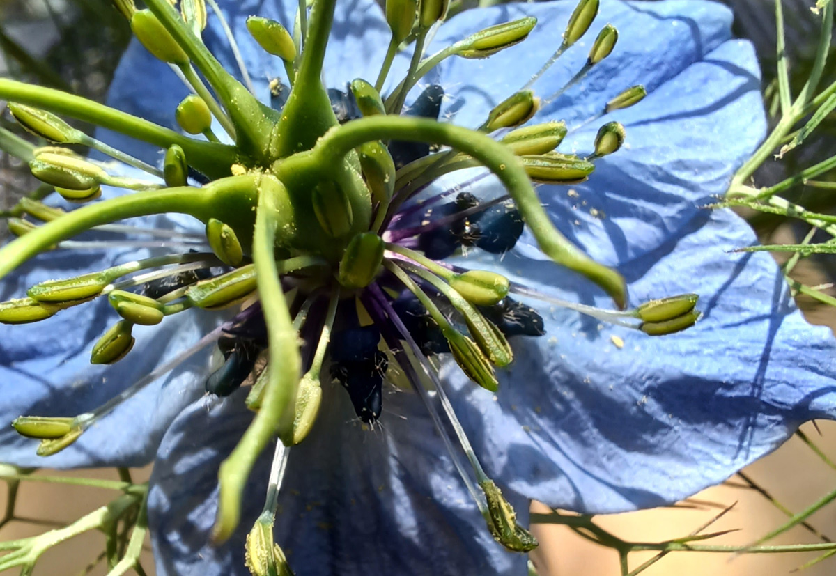 Das Rätsel ist wohl zu kompliziert. Die scheinbaren Ameisenköpfe sind Teile der Blüten von Nigella damascena, der Jungfer im Grünen.