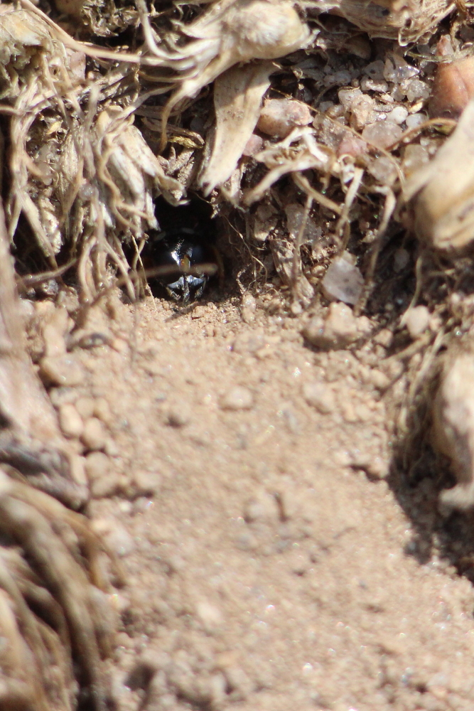 Allerdings war kein zweites Tier zu entdecken, und der Bau war auch noch nicht sehr tief: Kurz nachdem wir das Loch gesehen hatten kam der Käfer heraus. Es gelang uns auch nicht, irgendwelchen Tierkot in der näheren Umgebung aufzufinden. Der Bau war wohl noch ganz im Beginn.