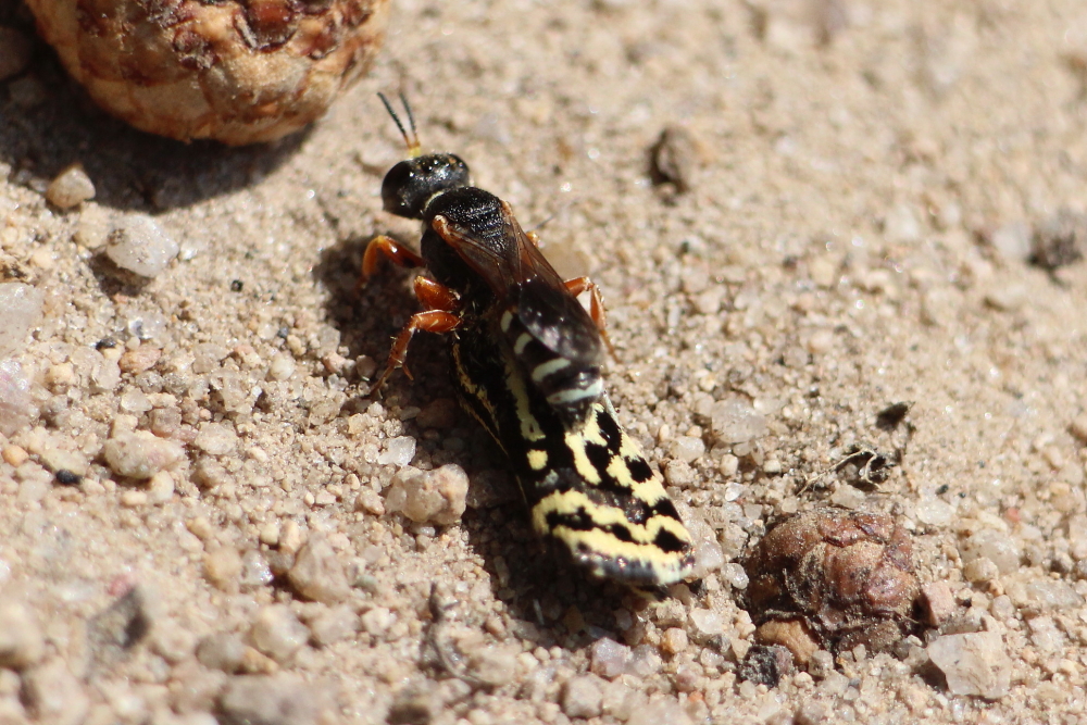 Bin mir nicht sicher, welche der beiden in frage kommenden Silbermundwespen ich hier beobachten konnte: entweder die Schmetterlingsjagende Silbermundwespe (Lestica subterranea) oder war es der Gemeine Schmetterlingsjäger (Lestica alata). Bereits im Juli 2020 hatte ich die ca. 7 Meter lange Brutkolonie entdeckt und deshalb gestern erneut aufgesucht.