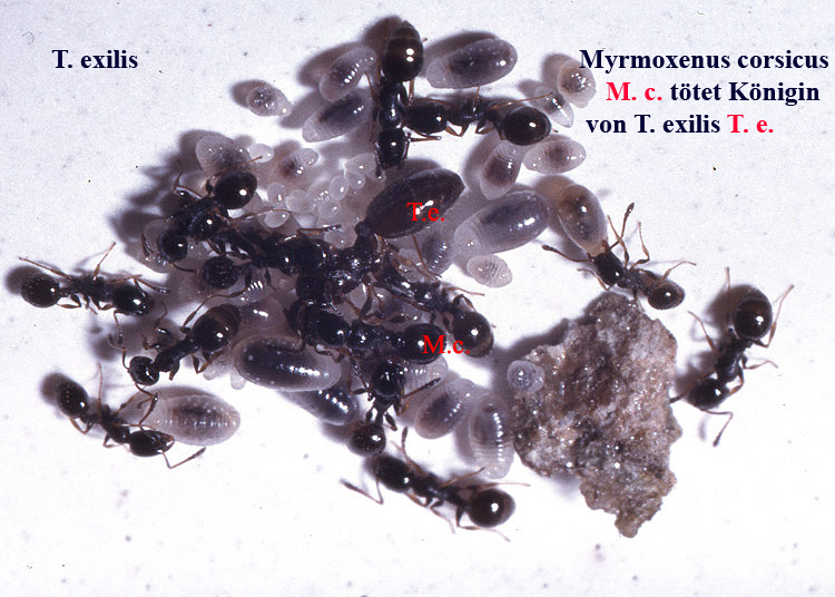 Lebendaufnahme einer T. corsicus – Gyne im Nest von T. exilis, im Begriff die große Wirtsart-Königin zu würgen. Beide Gynen sind schwarz.
