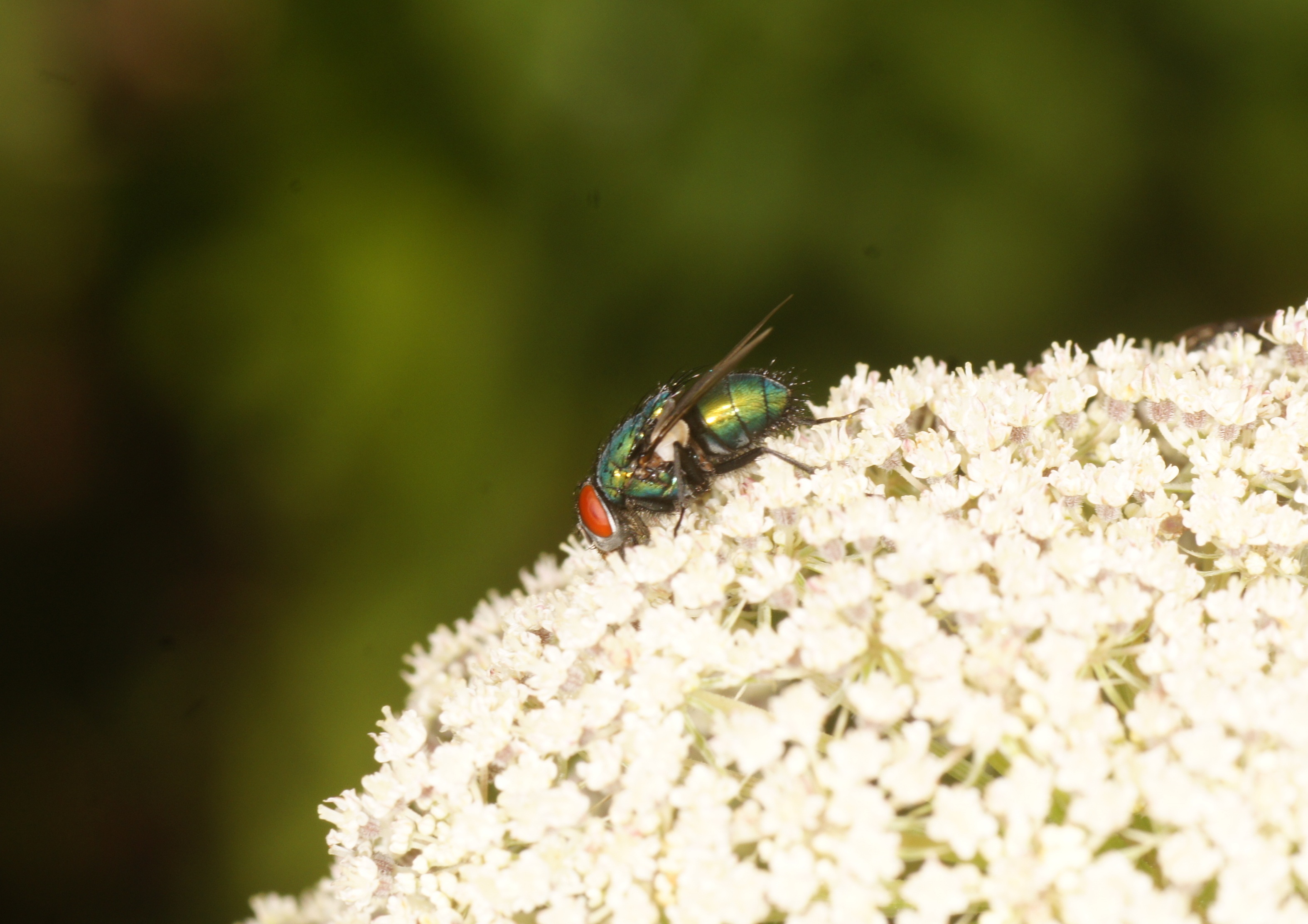 Im Hochbeet hatte ich im vorigen Jahr eine Karottenpflanze vergessen (Daucus carota). Heuer hat sie ausgetrieben und besitzt 3 Blütendolden. Welche Besucher sich da wohl einfinden?